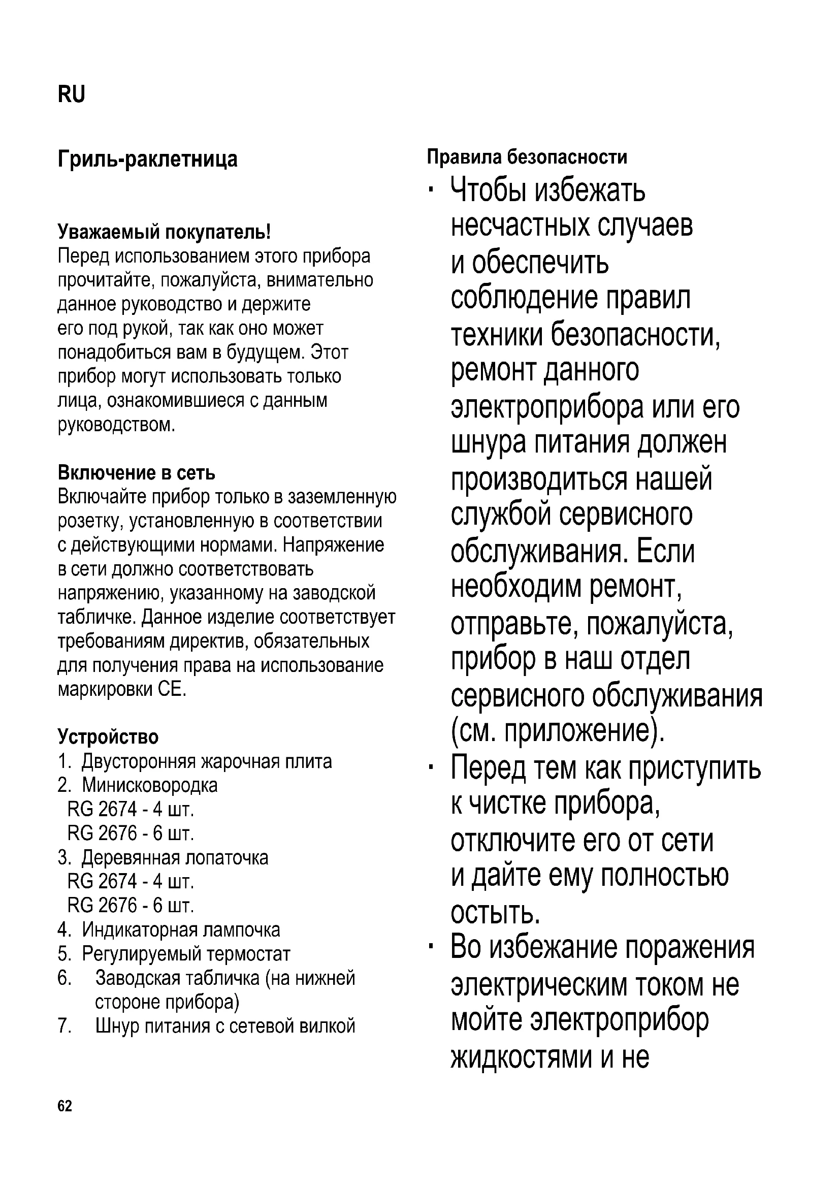 Гриль-раклетница Уважаемый покупатель! Перед использованием этого прибора прочитайте, пожалуйста, внимательно данное руководство и держите его под рукой, так как оно может понадобиться вам в будущем. Этот прибор могут использовать только лица, ознакомившиеся с данным руководством. Включение в сеть Включайте прибор только в заземленную розетку, установленную в соответствии с действующими нормами. Напряжение