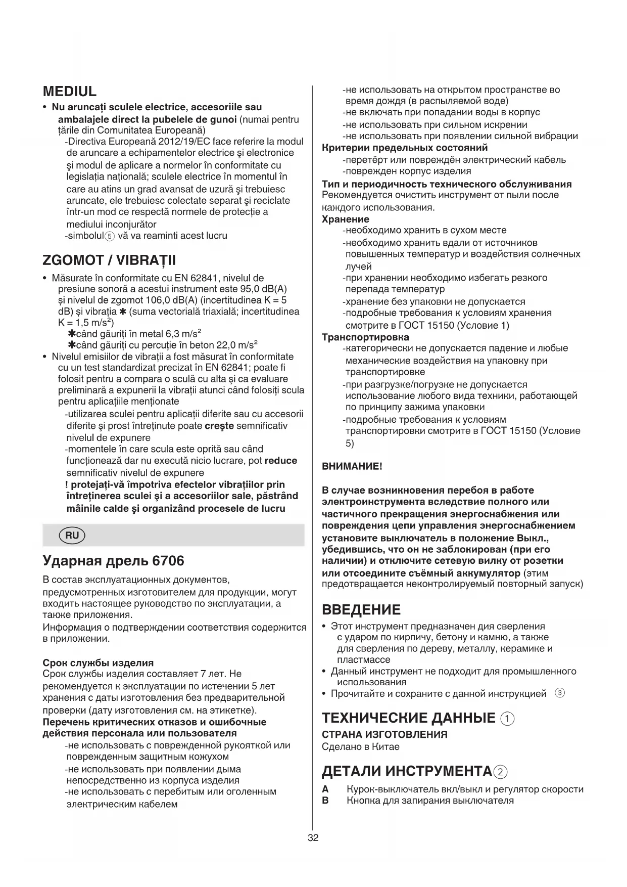 Ударная дрель 6706 В состав эксплуатационных документов, предусмотренных изготовителем для продукции, могут входить настоящее руководство по эксплуатации, а также приложения. Информация о подтверждении соответствия содержится в приложении. Срок службы изделия Срок службы изделия составляет 7 лет. Не рекомендуется к эксплуатации по истечении 5 лет хранения с даты изготовления без предварительной проверки (дату изготовления см. на этикетке). Перечень критических отказов и ошибочные действия персонала или пользователя - не использовать с поврежденной рукояткой или поврежденным защитным кожухом - не использовать при появлении дыма непосредственно из корпуса изделия - не использовать с перебитым или оголенным электрическим кабелем33 работы инструментом вероятность электрошока существенно возрастает. c) Оберегайте электроинструмент от воздействия дождя и влаги. Попадание воды в электроинструмент повышает вероятность электрического удара. d) Используйте кабель строго по назначению. Не допускается тянуть и передвигать электроинструмент за кабель или использовать кабель для вытягивания вилки из розетки. Оберегайте кабель инструмента от воздействия высоких температур, масла, острых кромок или движущихся частей электроинструмента. Поврежденный или спутанный кабель повышает возможность электрического удара. e) При работе на улице используйте удлинитель, предназначенный для работы вне помещения. Использование такого удлинителя снижает вероятность электрического удара. f) Если невозможно избежать применения электроинструмента в сыром помещении, то устанавливайте устройство защиты от утечки в землю. Использование устройства защиты от утечки в землю снижает риск электрического поражения.