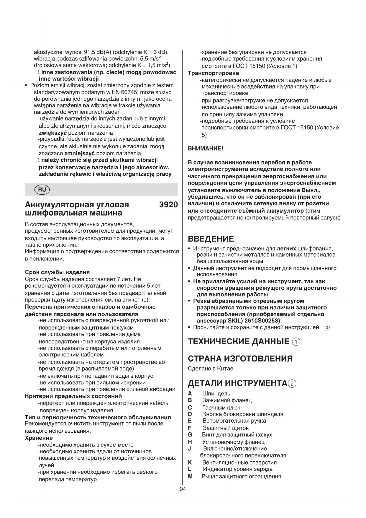 ! перед тем как выбросить аккумуляторы или направить их на утилизацию, изолируйте клеммы аккумуляторов прочной изоляционной лентой для исключения короткого замыкания ШУМ / ВИБРАЦИЯ