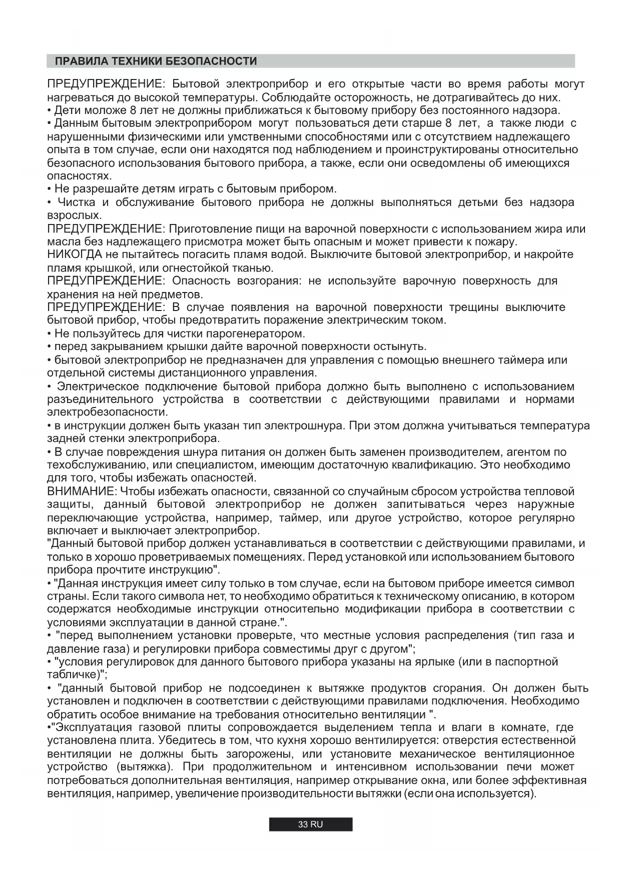 32 NL33 RU ПРАВИЛА ТЕХНИКИ БЕЗОПАСНОСТИ ПРЕДУПРЕЖДЕНИЕ: Бытовой электроприбор и его открытые части во время работы могут нагреваться до высокой температуры. Соблюдайте осторожность, не дотрагивайтесь до них.