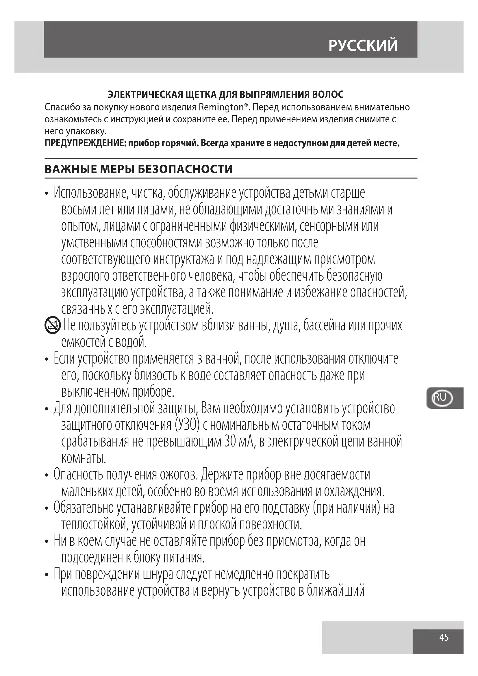 - Использование, чистка, обслуживание устройства детьми старше восьми лет или лицами, не обладающими достаточными знаниями и опытом, лицами с ограниченными физическими, сенсорными или умственными способностями возможно только после соответствующего инструктажа и под надлежащим присмотром взрослого ответственного человека, чтобы обеспечить безопасную эксплуатацию устройства, а также понимание и избежание опасностей, связанных с его эксплуатацией. B Не пользуйтесь устройством вблизи ванны, душа, бассейна или прочих емкостей с водой.
