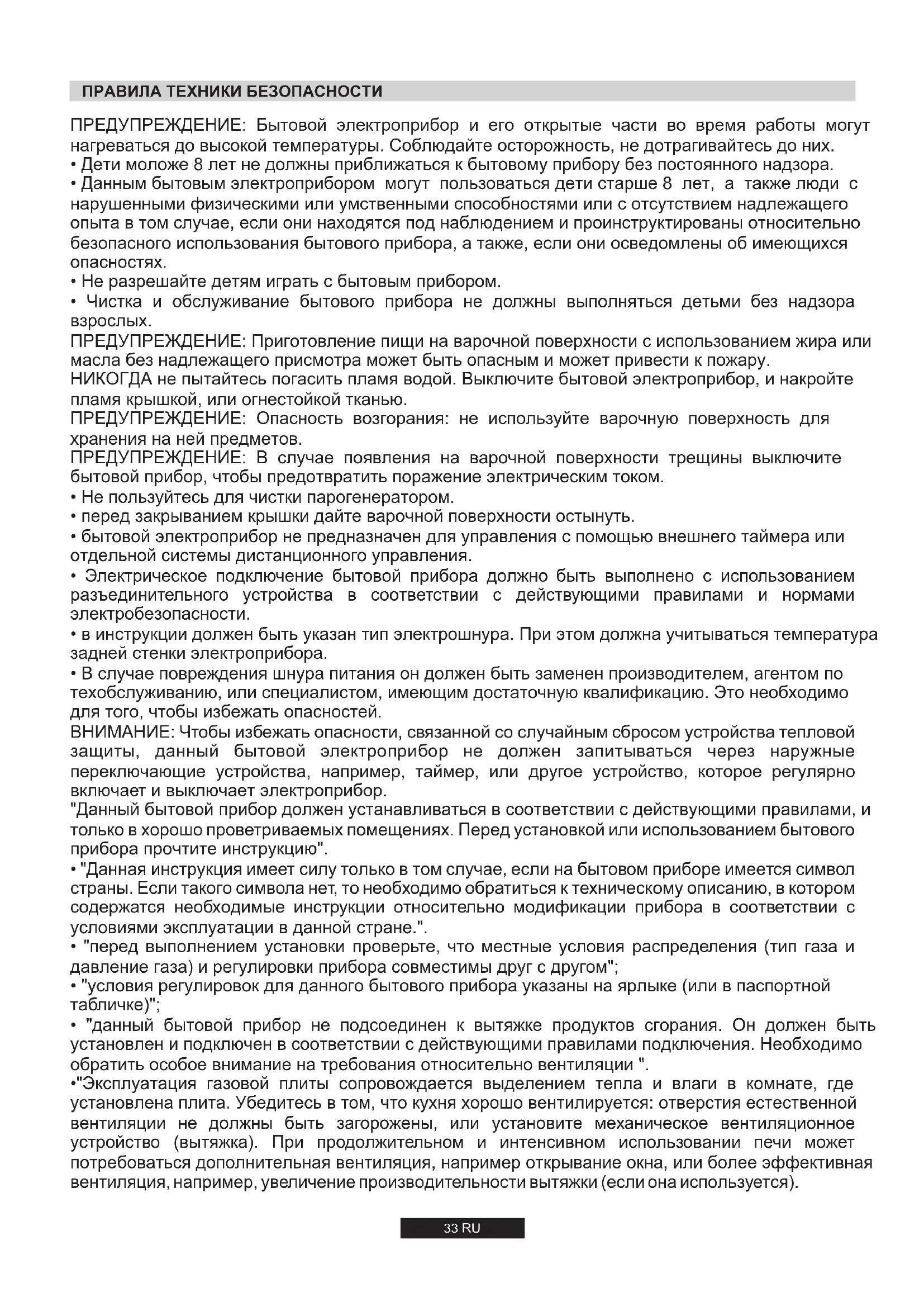 - В случае повреждения шнура питания он должен быть заменен производителем, агентом по техобслуживанию, или специалистом, имеющим достаточную квалификацию. Это необходимо для того, чтобы избежать опасностей. ВНИМАНИЕ: Чтобы избежать опасности, связанной со случайным сбросом устройства тепловой защиты, данный бытовой электроприбор не должен запитываться через наружные переключающие устройства, например, таймер, или другое устройство, которое регулярно включает и выключает электроприбор. "Данный бытовой прибор должен устанавливаться в соответствии с действующими правилами, и только в хорошо проветриваемых помещениях. Перед установкой или использованием бытового прибора прочтите инструкцию".