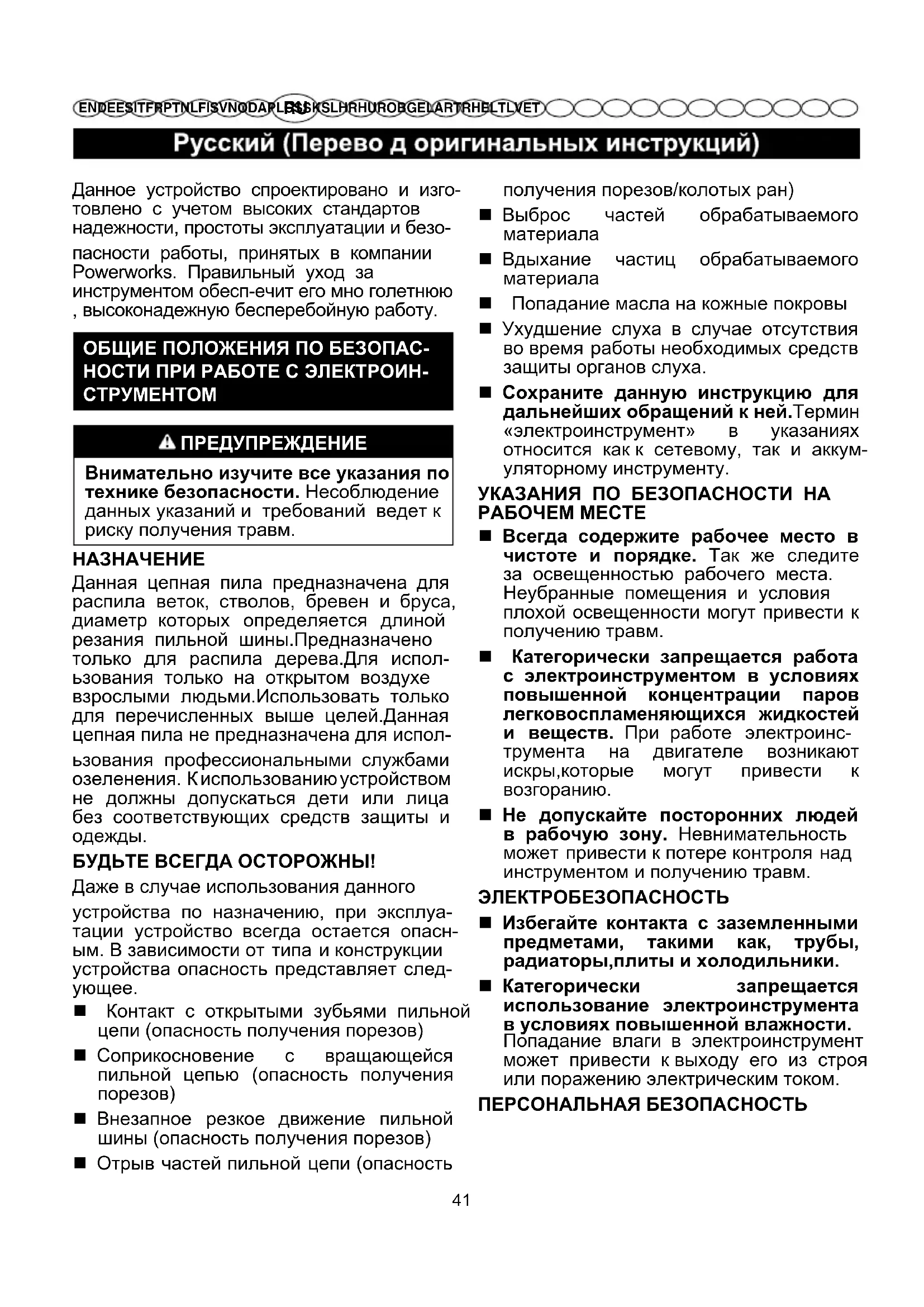 Попадание масла на кожные покровы Ухудшение слуха в случае отсутствия во время работы необходимых средств защиты органов слуха. Сохраните данную инструкцию для дальнейших обращений к ней.Термин «электроинструмент» в указаниях относится как к сетевому, так и аккум- уляторному инструменту. УКАЗАНИЯ ПО БЕЗОПАСНОСТИ НА РАБОЧЕМ МЕСТЕ Всегда содержите рабочее место в чистоте и порядке. Так же следите за освещенностью рабочего места. Неубранные помещения и условия плохой освещенности могут привести к получению травм. Категорически запрещается работа с электроинструментом в условиях повышенной концентрации паров легковоспламеняющихся жидкостей и веществ. При работе электроинс- трумента на двигателе возникают искры,которые могут привести к возгоранию. Не допускайте посторонних людей в рабочую зону. Невнимательность может привести к потере контроля над инструментом и получению травм. ЭЛЕКТРОБЕЗОПАСНОСТЬ Избегайте контакта с заземленными предметами, такими как, трубы, радиаторы,плиты и холодильники. Категорически запрещается использование электроинструмента в условиях повышенной влажности. Попадание влаги в электроинструмент может привести к выходу его из строя или поражению электрическим током. ПЕРСОНАЛЬНАЯ БЕЗОПАСНОСТЬ 41RU EN DE ES IT FR PT NL FI SV NO DA PL CS SK SL HR HU RO BG EL AR TR HE LT LV ET При использовании электроинструм- ента будьте аккуратны и внимате- льны. Не пользуйтесь инструментом, если вы устали, помните что это источник повышенной опасности для