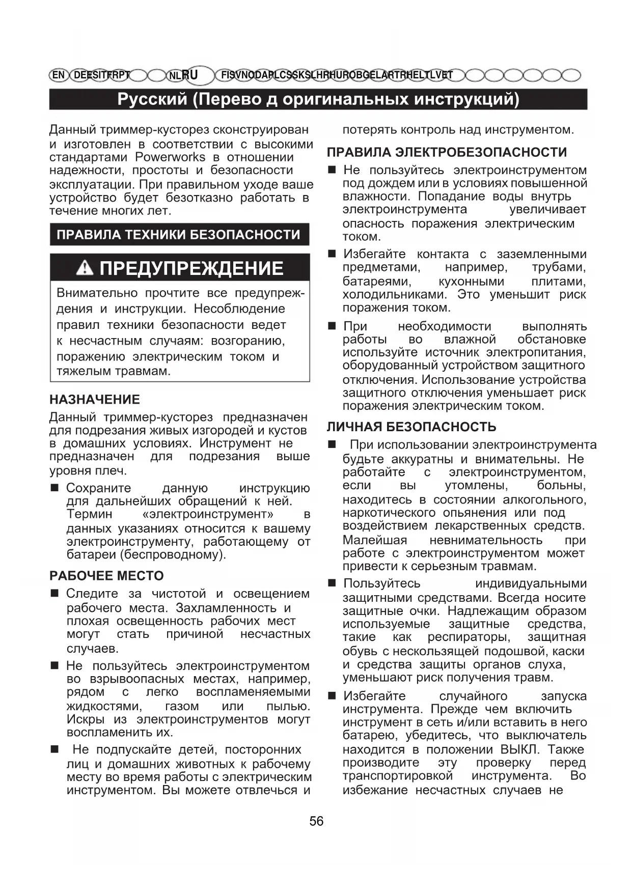 DE ES IT FR PT NL RU FI SV NO DA PL CS SK SL HR HU RO BG EL AR TR HE LT LV ET Данный триммер-кусторез сконструирован и изготовлен в соответствии с высокими стандартами Powerworks в отношении надежности, простоты и безопасности эксплуатации. При правильном уходе ваше устройство будет безотказно работать в течение многих лет. ПРАВИЛА ТЕХНИКИ БЕЗОПАСНОСТИ ПРЕДУПРЕЖДЕНИЕ Внимательно прочтите все предупреж- дения и инструкции. Несоблюдение правил техники безопасности ведет к несчастным случаям: возгоранию, поражению электрическим током и тяжелым травмам.
