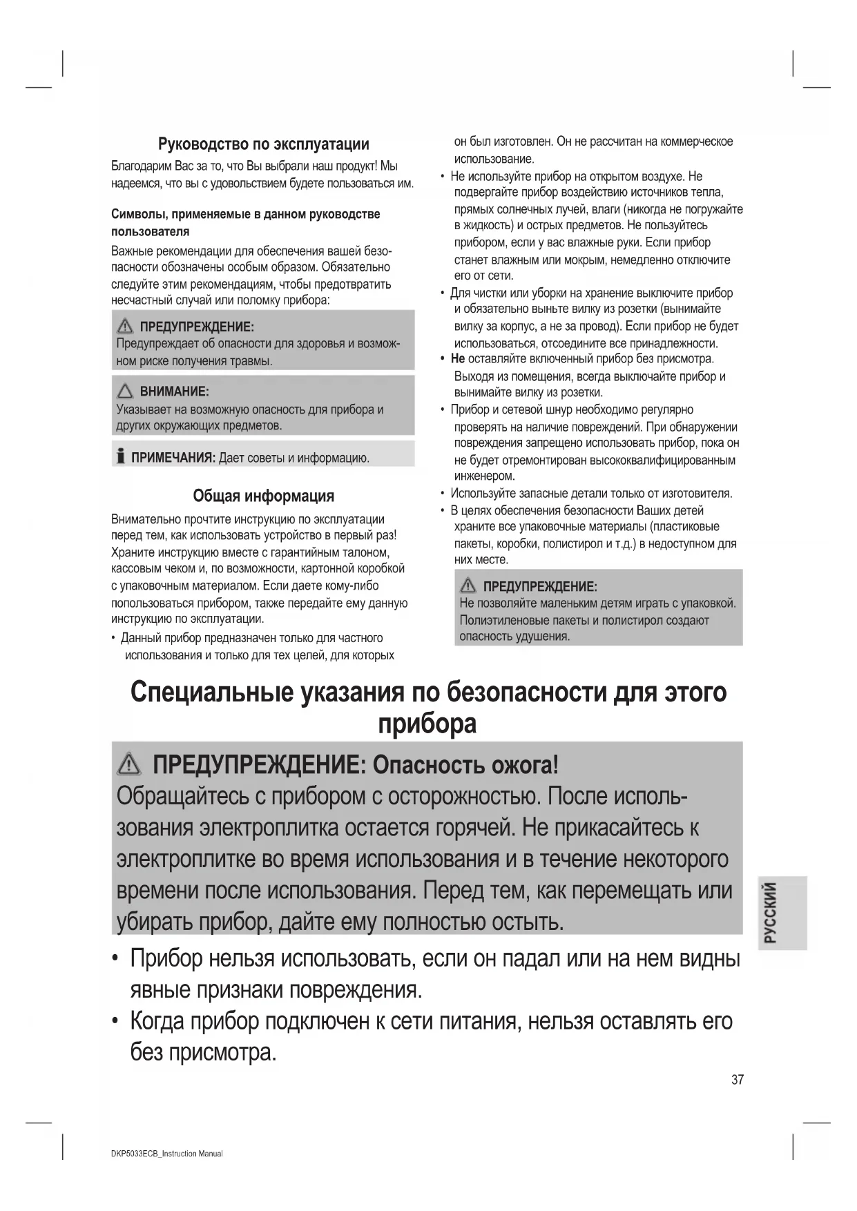 ПРЕДУПРЕЖДЕНИЕ: Опасность ожога! Обращайтесь с прибором с осторожностью. После исполь- зования электроплитка остается горячей. Не прикасайтесь к электроплитке во время использования и в течение некоторого времени после использования. Перед тем, как перемещать или убирать прибор, дайте ему полностью остыть.