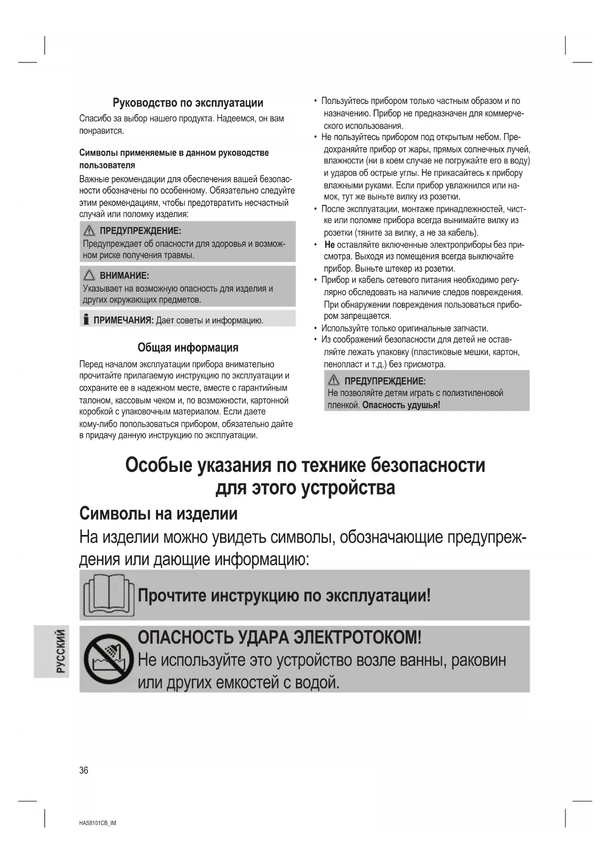 - Из соображений безопасности для детей не остав- ляйте лежать упаковку (пластиковые мешки, картон, пенопласт и т.д.) без присмотра. ПРЕДУПРЕЖДЕНИЕ: Не позволяйте детям играть с полиэтиленовой пленкой. Опасность удушья! Особые указания по технике безопасности для этого устройства Символы на изделии На изделии можно увидеть символы, обозначающие предупреж- дения или дающие информацию: Прочтите инструкцию по эксплуатации! ОПАСНОСТЬ УДАРА ЭЛЕКТРОТОКОМ! Не используйте это устройство возле ванны, раковин или других емкостей с водой.37