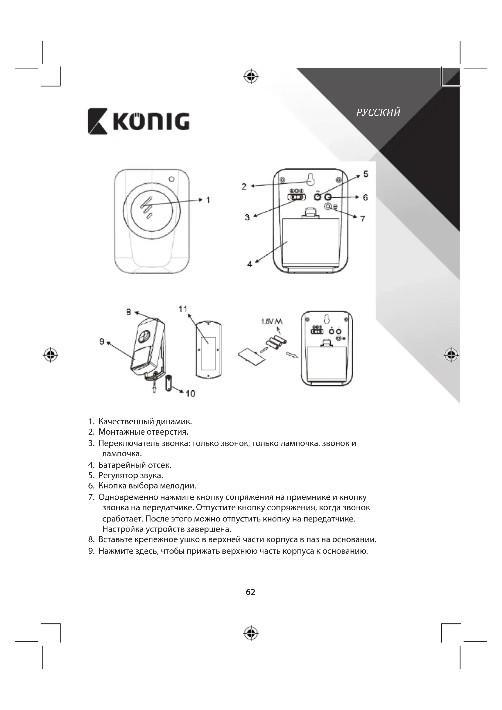 Снимите заднюю крышку батарейного отсека на основном устройстве и на кнопке звонка.РУССКИЙ
