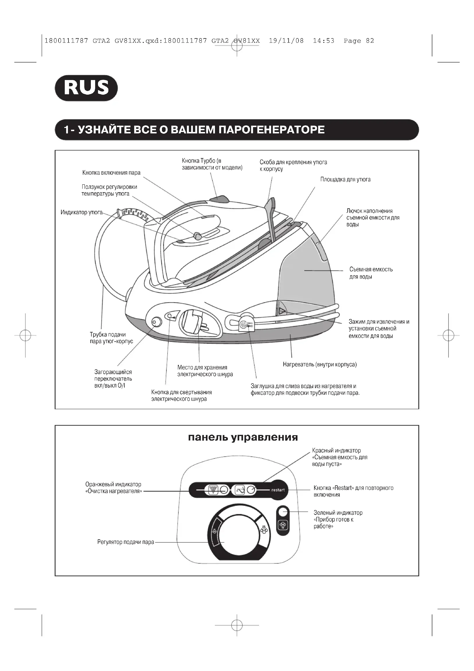 - ηٿÏÏËÏË (Ì ϤÁÌ· Ô˘ ·ÔÙÚ¤ÂÈ ÙËÓ ˘ÁÚÔÔ›ËÛË). 1800111787 GTA2 GV81XX.qxd:1800111787 GTA2 GV81XX 19/11/08 14:53 Page 811- УЗНАЙТЕ ВСЕ О ВАШЕМ ПАРОГЕНЕРАТОРЕ RUS панель управления Кнопка включения пара Кнопка Турбо (в зависимости от модели) Ползунок регулировки температуры утюга Съемная емкость