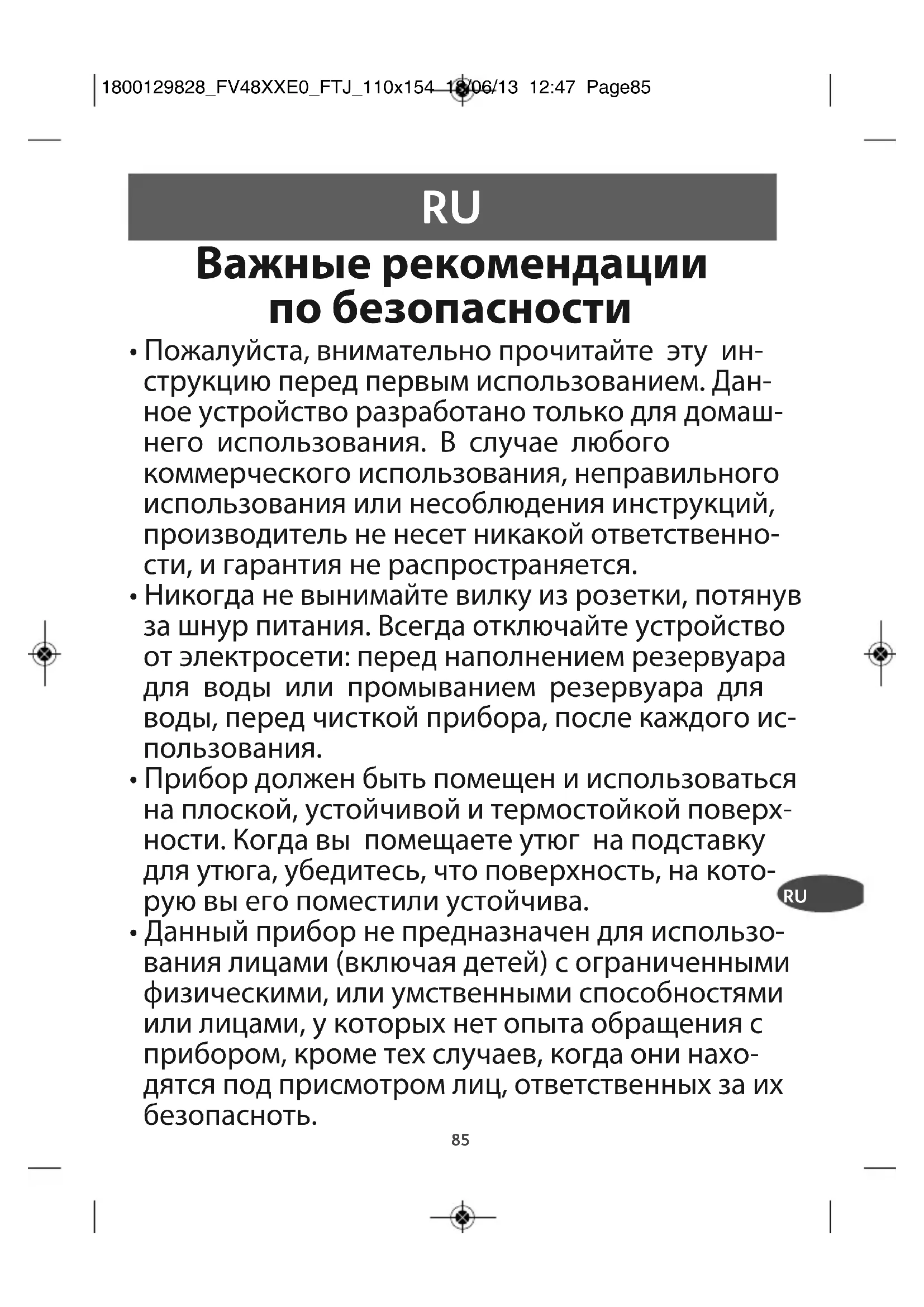 - Вилку необходимо удалить из розетки перед заполнением водой резервуара для воды. ПОЖАЛУЙСТА, СОХРАНИТЕ ЕТУ ИНСТРУКЦИЮ ПО ЭКСПЛУАТАЦИИ ДЛЯ ИСПОЛЬЗОВАНИЯ В БУДУЩЕМ 1800129828_FV48XXE0_FTJ_110x154 18/06/13 12:47 Page8788