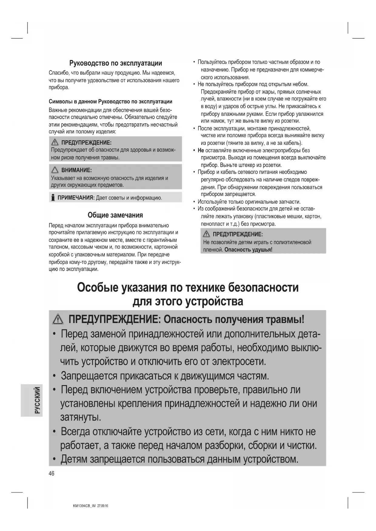 - Детям запрещается пользоваться данным устройством.47 KM1394CB_IM 27.09.16 ПРЕДУПРЕЖДЕНИЕ: Опасность получения травмы!