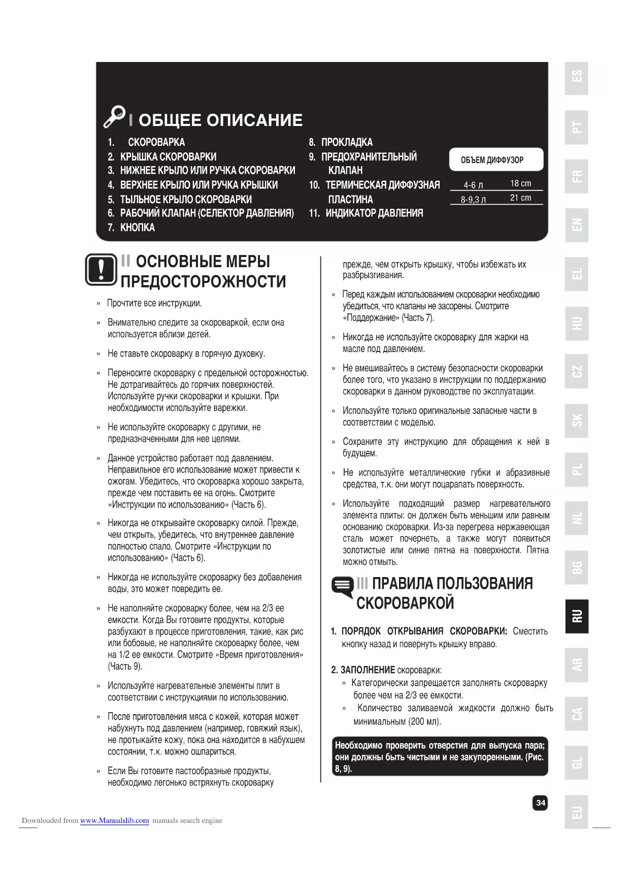 ОСНОВНЫЕ МЕРЫ ПРЕДОСТОРОЖНОСТИ прежде, чем открыть крышку, чтобы избежать их разбрызгивания. » Перед каждым использованием скороварки необходимо убедиться, что клапаны не засорены. Смотрите «Поддержание» (Часть 7). » Никогда не используйте скороварку для жарки на масле под давлением. » Не вмешивайтесь в систему безопасности скороварки более того, что указано в инструкции по поддержанию скороварки в данном руководстве по эксплуатации. » Используйте только оригинальные запасные части в соответствии с моделью. » Сохраните эту инструкцию для обращения к ней в