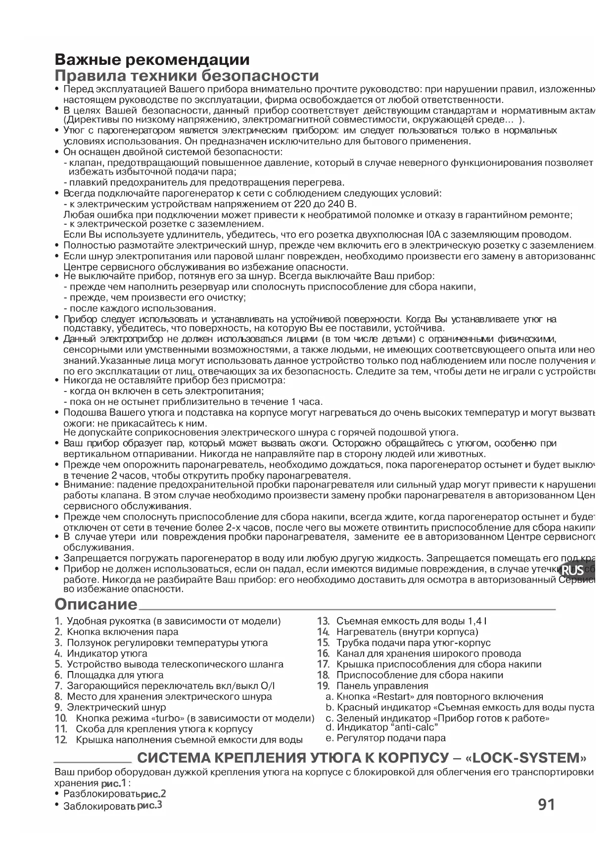 Ваш прибор образует пар, который может вызвать ожоги. Осторожно обращайтесь с утюгом, особенно при вертикальном отпаривании. Никогда не направляйте пар в сторону людей или животных. Прежде чем опорожнить паронагреватель, необходимо дождаться, пока парогенератор остынет и будет выключенв течение 2 часов, чтобы открутить пробку паронагревателя. Внимание: падение предохранительной пробки паронагревателя или сильный удар могут привести к нарушениюработы клапана. В этом случае необходимо произвести замену пробки паронагревателя в авторизованном Центресервисного обслуживания. Прежде чем сполоснуть приспособление для сбора накипи, всегда ждите, когда парогенератор остынет и будетотключен от сети в течение более 2-х часов, после чего вы можете отвинтить приспособление для сбора накипи. В случае утери или повреждения пробки паронагревателя, замените ее в авторизованном Центре сервисногообслуживания. Запрещается погружать парогенератор в воду или любую другую жидкость. Запрещается помещать его под кран. Прибор не должен использоваться, если он падал, если имеются видимые повреждения, в случае утечки или сбоев вработе. Никогда не разбирайте Ваш прибор: его необходимо доставить для осмотра в авторизованный Сервисный центрво избежание опасности. Удобная рукоятка (в зависимости от модели) Кнопка включения пара Ползунок регулировки температуры утюга Индикатор утюга Устройство вывода телескопического шланга Площадка для утюга Загорающийся переключатель вкл/выкл O/I Место для хранения электрического шнура Электрический шнур Кнопка режима «turbo» (в зависимости от модели) Скоба для крепления утюга к корпусу Крышка наполнения съемной емкости для воды Съемная емкость для воды 1,4 l Нагреватель (внутри корпуса) Трубка подачи пара утюг-корпус Канал для хранения широкого провода Крышка приспособления для сбора накипи Приспособление для сбора накипи Панель управленияa. Кнопка «Restart» для повторного включенияb. Красный индикатор «Съемная емкость для воды пуста»c. Зеленый индикатор «Прибор готов к работе»d. Индикатор “anti-calc”e. Регулятор подачи пара
