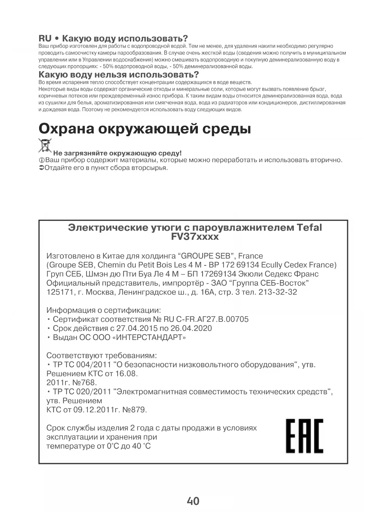 - ТР ТС 020/2011 "Электромагнитная совместимость технических средств", утв. Решением КТС от 09.12.2011г. №879. Срок службы изделия 2 года с даты продажи в условиях эксплуатации и хранения при температуре от 0°С до 40 °С 1800136985 FV37XX E0 A11.qxp_110x154 02/06/15 09:39 Page4041 ВОЗМОЖНЫЕ ПРИЧИНЫ СПОСОБ УСТРАНЕНИЯ Вода подтекает черезотверстия в подошве.Выбранная температуранедостаточна для образованияпара.Утюг недостаточно нагрет дляотпаривания.Вы слишком часто нажимаете накнопку подачи парового удара.Слишком сильная подача пара. Утюг хранился в горизонтальномположении, резервуар не былопорожнен, а регулятор не былустановлен в положение .Установите термостат в зону пара (от •• до МАХ).Дождитесь, пока сигнальная лампочкапогаснет.Соблюдайте интервал в несколько секундперед каждым нажатием. Уменьшите подачу пара.См. раздел "Хранение утюга".Коричневые подтекииз подошвы пачкаютбелье.Использование химическихпродуктов для удаления накипи.Используется не тот тип воды.Волокна тканей набиваются вотверстия подошвы иобугливаются.Вы плохо прополоскали белье,либо погладили новое,непостиранное белье.Не добавляйте в резервуар никаких средствдля удаления накипи.Произведите автоочистку и прочитайте главу"Какую воду использовать?".Произведите автоочистку и очистите подошвувлажной тряпочкой. Время от времениочищайте отверстия подошвы.Убедитесь, что белье достаточнопрополоскано, чтобы удалить возможныеотложения мыла или химических средств нановой одежде.Грязная иликоричневая подошвапачкает белье.Глажение при слишком высокойтемпературе.Вы используете крахмал приглажке.Очистите подошву, как указано выше.Отрегулируйте термостат в соответствии стаблицей температур.Очистите подошву, как указано выше.Добавляйте крахмал с изнаночной стороны.Незначительноеколичество илиотсутствие пара.Резервуар пуст.Противоизвестковый стерженьзагрязнен.Отложение накипи в утюге.Утюг слишком долгоиспользовался без пара.Заполните его.Очистите противоизвестковый стержень.Очистите противоизвестковый стержень ивыполните самоочистку.Выполните самоочистку.Подошва поцарапанаили повреждена.Утюг стоял в горизонтальномположении на металлическойподставке.Всегда ставьте утюг на пяту-опору.При заполнениирезервуара образуется Регулятор подачи пара не былустановлен в положение .Емкость для воды переполнена.Убедитесь, что регулятор подачи паранаходится в положении .Не превышайте Мах отметку.Пульверизатор нераспыляет воду.Емкость для воды недостаточнозаполнена.Наполните емкость для воды. Возможные неполадки При любых других возможных неполадках обращайтесь в авторизованный сервисный центр для проверки утюга. 1800136985 FV37XX E0 A11.qxp_110x154 02/06/15 09:39 Page41Характер проблеми Ймовiрнi випадки Рекомендацiї Вода тече черездiрки у пiдошвiВибрана температура недозволяє створювати пару.Ви використовуєте пару, тодiяк праска недостатньо гаряча.Ви занадто часто використовуєте ручку парового удару.Струмiнь пари є занадто.сильним.Ви поставили праскуплиском, не випорожнивши їїi не встановивши ручку пари Переведiть ручку термостата в секторпари (мiж •• i МАХ).Зачекайте поки не вимкнетьсясигнальна лампочка.Зачекайте декiлька секунд передкожним використанням.Зменшiть струмiнь.Подивiться роздiл “Поставте вашупраску”.Коричневi слiдивитiкання води зпiдошви бруднятьбiлизну.Ви використовуєте хiмiчнi