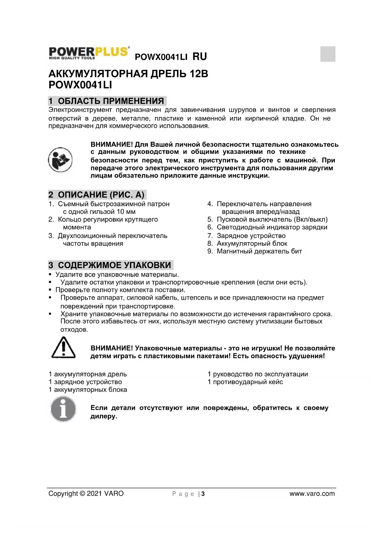 Ваша аккумуляторная дрель оснащена мягкой рукояткой TPR и предохранительными элементами. TPR (термопластичная резина) является эластичным, амортизирующим и благоприятным для окружающей среды (перерабатываемым) материалом.POWX0041LI RU Copyright © 2021 VARO P a g e | 9 www.varo.com 8 ПЕРЕД И ВО ВРЕМЯ ЭКСПЛУАТАЦИИ