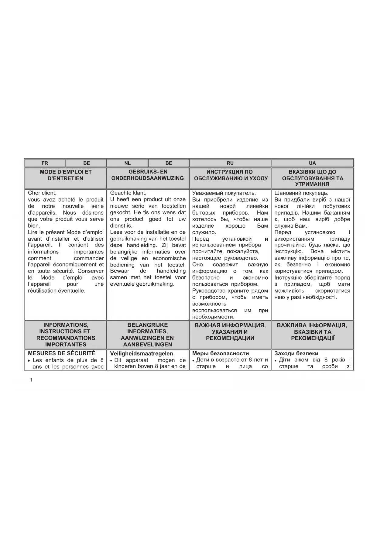 Les différentes possibilités de son utilisation sont décrites de manière exhaustive dans le présent Manuel. Doel van het toestel Het toestel is voor een gewone voorbereiding van gerechten thuis bepaald en zou niet voor andere doeleinden gebruikt worden. De mogelijke toepassingen van het toestel zijn uitgebreid in deze handleiding beschreven. Предназначение прибора Прибор предназначен для ежедневного домашнего приготовления пищи и не должен использоваться для других целей. Отдельные варианты использования подробно описаны в данном руководстве. Призначення приладу Прилад призначений для щоденного домашнього приготування їжі і не повинен використовуватися для інших цілей. Окремі варіанти використання докладно описані в цьому посібнику.