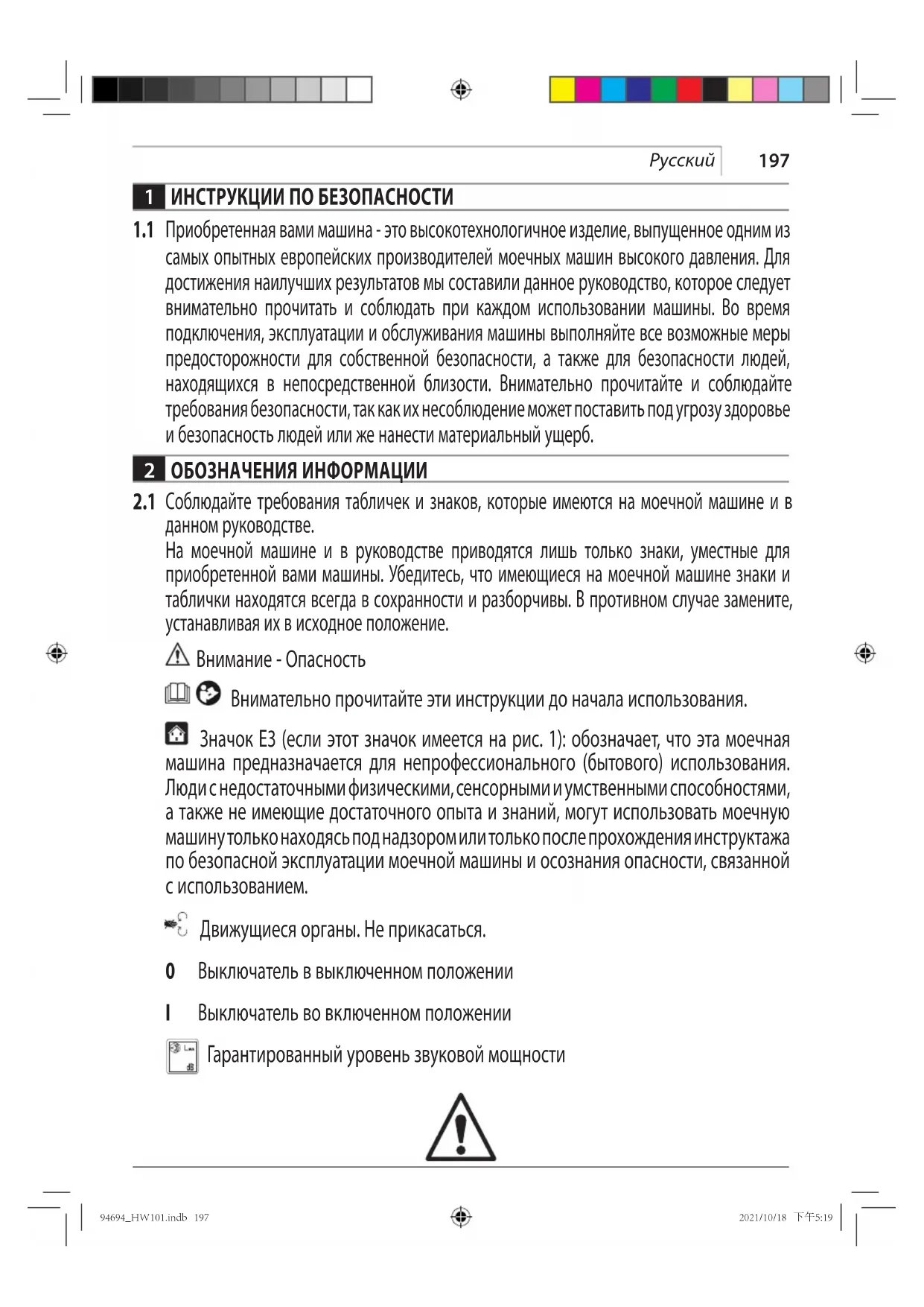 Соблюдайте требования табличек и знаков, которые имеются на моечной машине и в данном руководстве. На моечной машине и в руководстве приводятся лишь только знаки, уместные для приобретенной вами машины. Убедитесь, что имеющиеся на моечной машине знаки и таблички находятся всегда в сохранности и разборчивы. В противном случае замените, устанавливая их в исходное положение. Внимание - Опасность Внимательно прочитайте эти инструкции до начала использования. Значок Е3 (если этот значок имеется на рис. 1): обозначает, что эта моечная машина предназначается для непрофессионального (бытового) использования. Люди с недостаточными физическими, сенсорными и умственными способностями, а также не имеющие достаточного опыта и знаний, могут использовать моечную машину только находясь под надзором или только после прохождения инструктажа по безопасной эксплуатации моечной машины и осознания опасности, связанной с использованием. Движущиеся органы. Не прикасаться. 0 Выключатель в выключенном положении I Выключатель во включенном положении Гарантированный уровень звуковой мощности 94694_HW101.indb 19794694_HW101.indb 197 2021/10/18 下午5:192021/10/18 下午5:19198