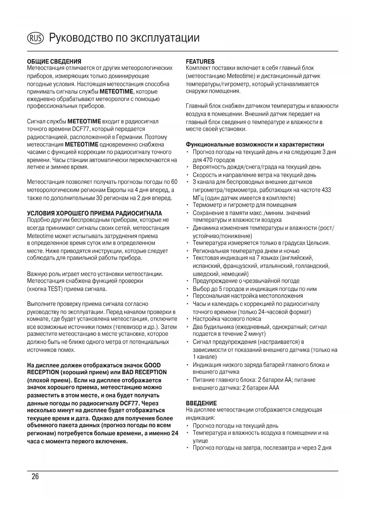 ОБЩИЕ СВЕДЕНИЯ Метеостанция отличается от других метеорологических приборов, измеряющих только доминирующие погодные условия. Настоящая метеостанция способна принимать сигналы службы METEOTIME, которые ежедневно обрабатывают метеорологи с помощью профессиональных приборов. Сигнал службы METEOTIME входит в радиосигнал точного времени DCF77, который передается радиостанцией, расположенной в Германии. Поэтому метеостанция METEOTIME одновременно снабжена часами с функцией коррекции по радиосигналу точного времени. Часы станции автоматически переключаются на летнее и зимнее время. Метеостанция позволяет получать прогнозы погоды по 60 метеорологическим регионам Европы на 4 дня вперед, а также по дополнительным 30 регионам на 2 дня вперед. УСЛОВИЯ ХОРОШЕГО ПРИЕМА РАДИОСИГНАЛА Подобно другим беспроводным приборам, которые не всегда принимают сигналы своих сетей, метеостанция Meteotime может испытывать затруднения приема в определенное время суток или в определенном месте. Ниже приводятся инструкции, которые следует соблюдать для правильной работы прибора. Важную роль играет место установки метеостанции. Метеостанция снабжена функцией проверки (кнопка TEST) приема сигнала. Выполните проверку приема сигнала согласно руководству по эксплуатации. Перед началом проверки в комнате, где будет установлена метеостанция, отключите все возможные источники помех (телевизор и др.). Затем разместите метеостанцию в месте установке, которое должно быть не ближе одного метра от потенциальных источников помех. На дисплее должен отображаться значок GOOD RECEPTION (хороший прием) или BAD RECEPTION (плохой прием). Если на дисплее отображается значок хорошего приема, метеостанцию можно разместить в этом месте, и она будет получать данные погоды по радиосигналу DCF77. Через несколько минут на дисплее будет отображаться текущее время и дата. Однако для получения более объемного пакета данных (прогноз погоды по всем регионам) потребуется больше времени, а именно 24 часа с момента первого включения. FEATURES Комплект поставки включает в себя главный блок (метеостанцию Meteotime) и дистанционный датчик температуры/гигрометр, который устанавливается снаружи помещения. Главный блок снабжен датчиком температуры и влажности воздуха в помещении. Внешний датчик передает на главный блок сведения о температуре и влажности в месте своей установки. Функциональные возможности и характеристики