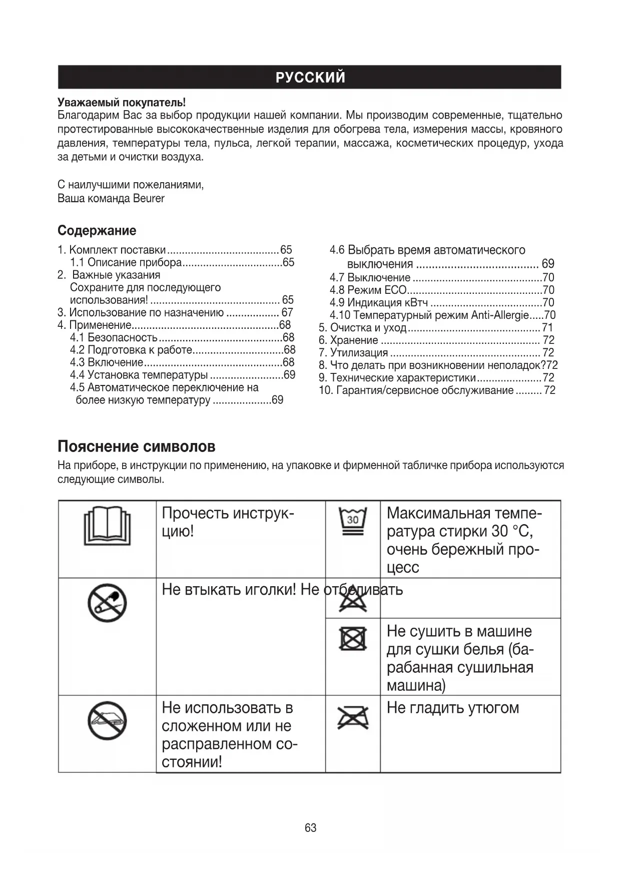 Уважаемый покупатель! Благодарим Вас завыбор продукции нашей компании. Мы производим современные, тщательно протестированные высококачественные изделия для обогрева тела, измерения массы, кровяного давления, температуры тела, пульса, легкой терапии, массажа, косметических процедур, ухода задетьми иочистки воздуха. Снаилучшими пожеланиями, Ваша команда Beurer64 Запрещается исполь- зовать для маленьких детей (до 3 лет). Химчистка запрещена