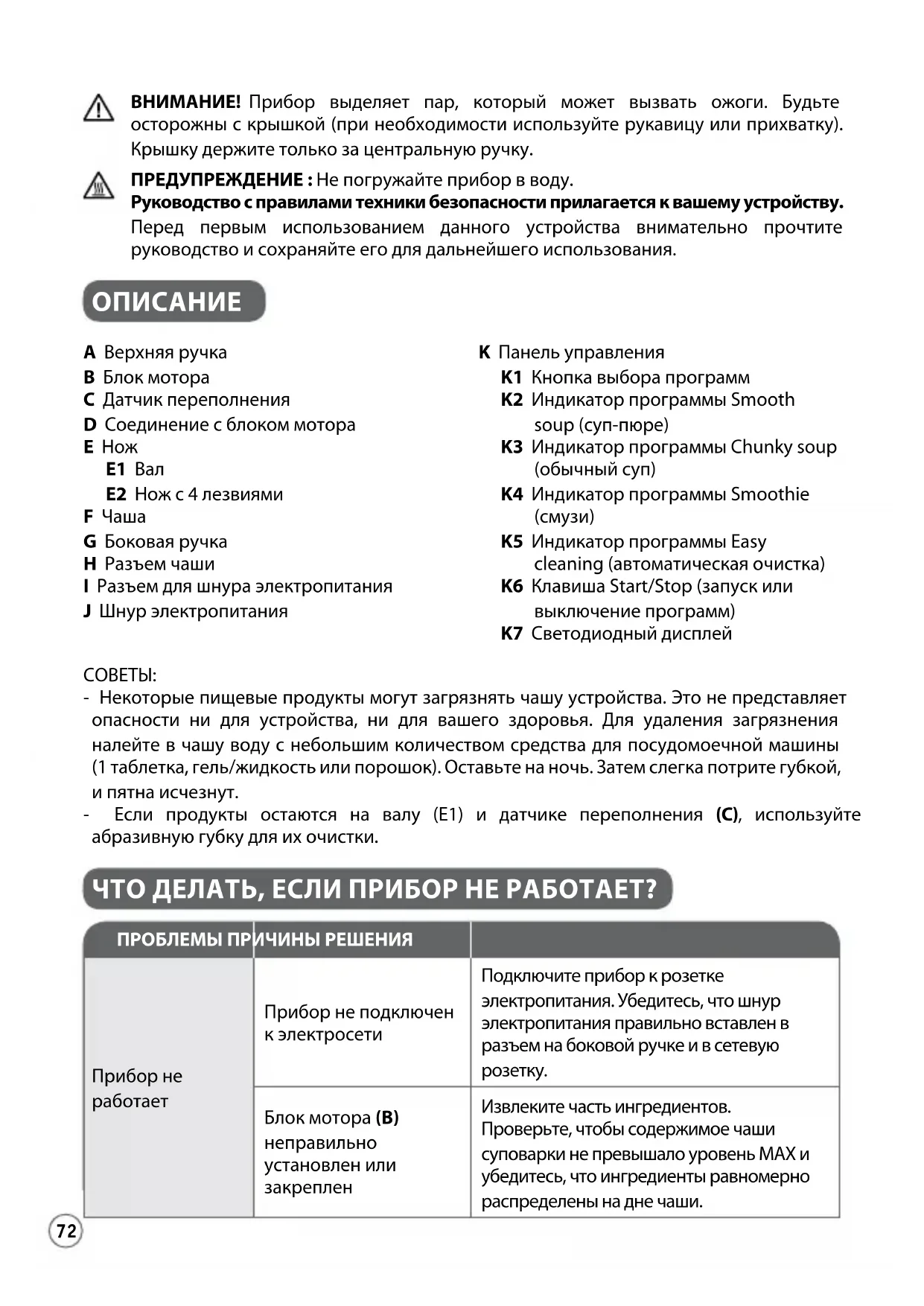 - Некоторые пищевые продукты могут загрязнять чашу устройства. Это не представляет опасности ни для устройства, ни для вашего здоровья. Для удаления загрязнения налейте в чашу воду с небольшим количеством средства для посудомоечной машины (1 таблетка, гель/жидкость или порошок). Оставьте на ночь. Затем слегка потрите губкой, и пятна исчезнут. - Если продукты остаются на валу (E1) и датчике переполнения (C), используйте абразивную губку для их очистки. ВНИМАНИЕ! Прибор выделяет пар, который может вызвать ожоги. Будьте осторожны с крышкой (при необходимости используйте рукавицу или прихватку). Крышку держите только за центральную ручку. ПРЕДУПРЕЖДЕНИЕ : Не погружайте прибор в воду. Руководство с правилами техники безопасности прилагается к вашему устройству. Перед первым использованием данного устройства внимательно прочтите руководство и сохраняйте его для дальнейшего использования.73