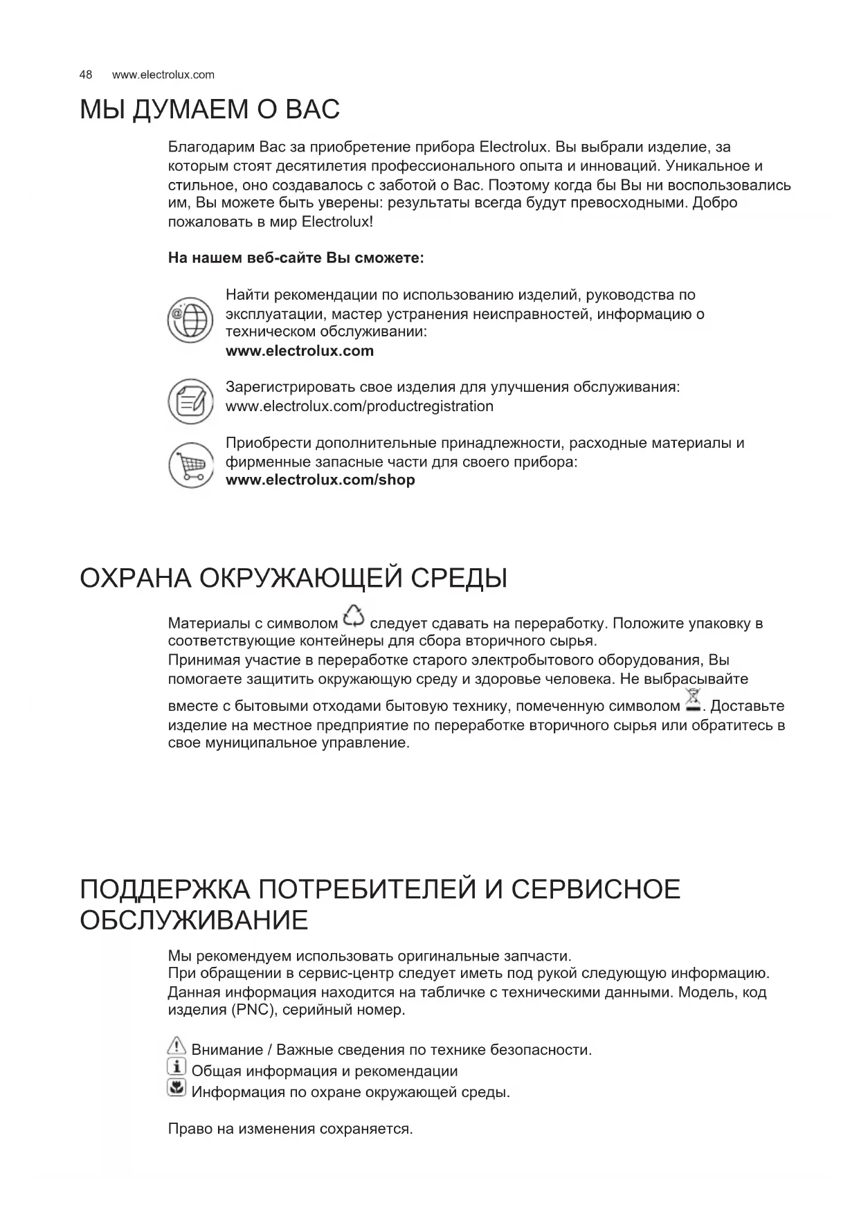 рекомендации по использованию изделий, руководства по эксплуатации, мастер устранения неисправностей, информацию о техническом обслуживании: www.electrolux.com Зарегистрировать свое изделия для улучшения обслуживания: www.electrolux.com/productregistration Приобрести дополнительные принадлежности, расходные материалы и фирменные запасные части для своего прибора: www.electrolux.com/shop ОХРАНА ОКРУЖАЮЩЕЙ СРЕДЫ Материалы с символом следует сдавать на переработку. Положите упаковку в соответствующие контейнеры для сбора вторичного сырья. Принимая участие в переработке старого электробытового оборудования, Вы помогаете защитить окружающую среду и здоровье человека. Не выбрасывайте вместе с бытовыми отходами бытовую технику, помеченную символом . Доставьте изделие на местное предприятие по переработке вторичного сырья или обратитесь в свое муниципальное управление. ПОДДЕРЖКА ПОТРЕБИТЕЛЕЙ И СЕРВИСНОЕ ОБСЛУЖИВАНИЕ Мы рекомендуем использовать оригинальные запчасти. При обращении в сервис-центр следует иметь под рукой следующую информацию. Данная информация находится на табличке с техническими данными. Модель, код изделия (PNC), серийный номер. Внимание / Важные сведения по технике безопасности. Общая информация и рекомендации Информация по охране окружающей среды. Право на изменения сохраняется. RU РУК
