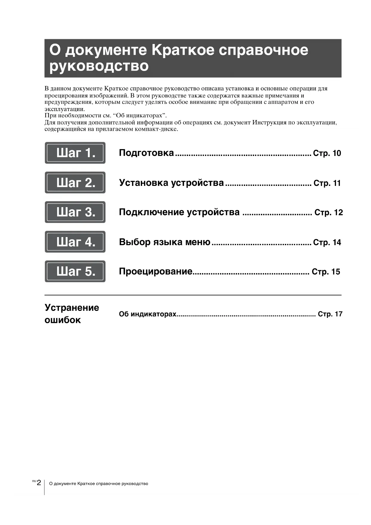 В данном документе Краткое справочное руководство описана установка и основные операции для проецирования изображений. В этом руководстве также содержатся важные примечания и предупреждения, которым следует уделять особое внимание при обращении с аппаратом и его эксплуатации.При необходимости см. “Об индикаторах”.Для получения дополнительной информации об операциях см. документ Инструкция по эксплуатации, содержащийся на прилагаемом компакт-диске. О документе Краткое справочное руководство Подготовка............................................................ Cтр. 10 Установка устройства...................................... Cтр. 11 Подключение устройства ............................... Cтр. 12 Выбор языка меню............................................ Cтр. 14 Проецирование.................................................... Cтр. 15