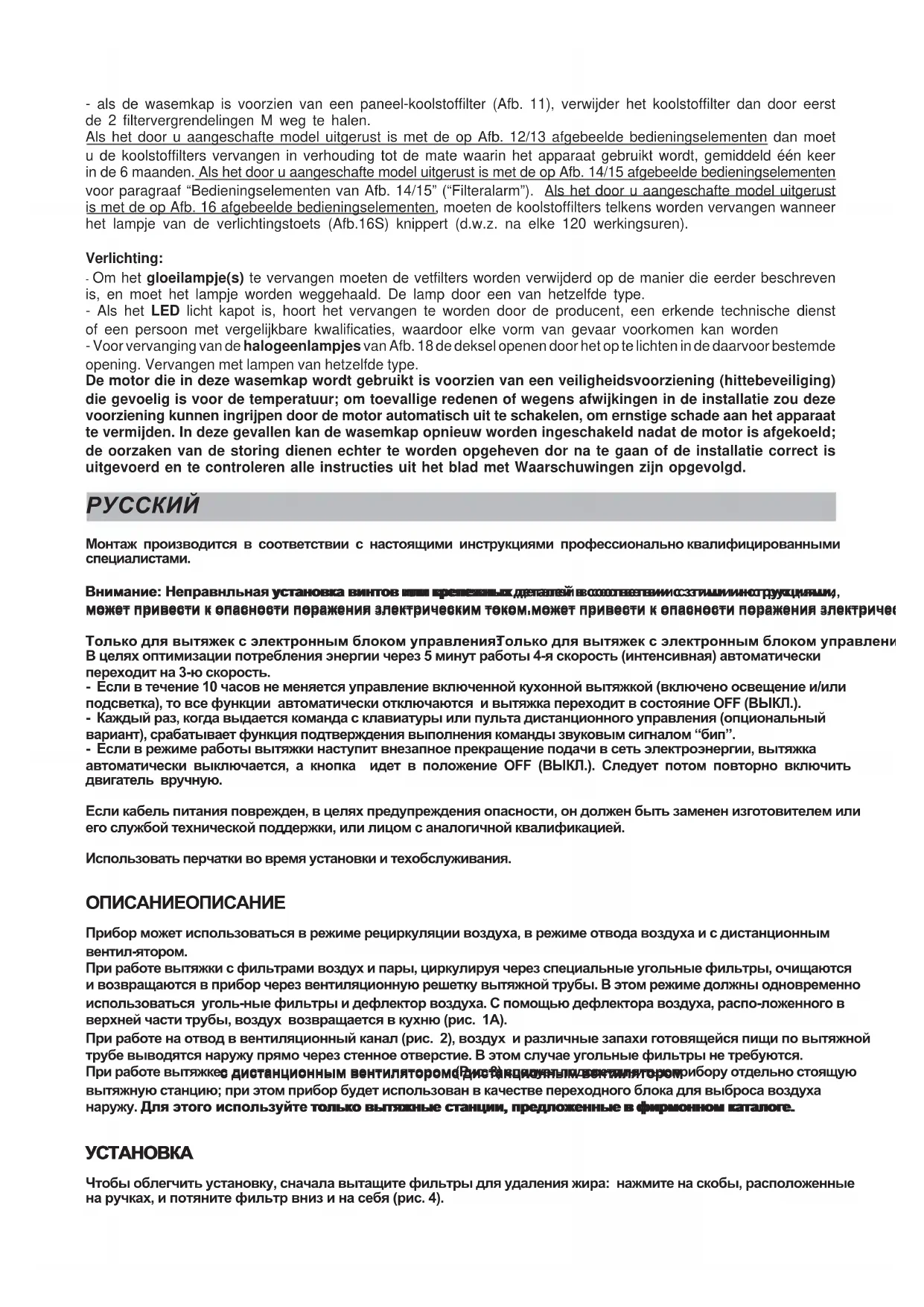 Монтаж производится в соответствии с настоящими инструкциями профессионально квалифицированными специалистами. Внимание: Неправнльная установка винтов или крепежныx дeтaлeй в cooтвeтвии c зтими инcтpyкциями,Внимание: Неправнльная установка винтов или крепежныx дeтaлeй в cooтвeтвии c зтими инcтpyкциями, Внимание: Неправнльная установка винтов или крепежныx дeтaлeй в cooтвeтвии c зтими инcтpyкциями,Внимание: Неправнльная установка винтов или крепежныx дeтaлeй в cooтвeтвии c зтими инcтpyкциями, Внимание: Неправнльная установка винтов или крепежныx дeтaлeй в cooтвeтвии c зтими инcтpyкциями, мoжeт пpивecти к oпacнocти пopaжeния злeктpичecким тoкoм.мoжeт пpивecти к oпacнocти пopaжeния злeктpичecким тoкoм. мoжeт пpивecти к oпacнocти пopaжeния злeктpичecким тoкoм.мoжeт пpивecти к oпacнocти пopaжeния злeктpичecким тoкoм. мoжeт пpивecти к oпacнocти пopaжeния злeктpичecким тoкoм. Только для вытяжек с электронным блоком управленияТолько для вытяжек с электронным блоком управления Только для вытяжек с электронным блоком управленияТолько для вытяжек с электронным блоком управления Только для вытяжек с электронным блоком управления: В целях оптимизации потребления энергии через 5 минут работы 4-я скорость (интенсивная) автоматически переходит на 3-ю скорость. - Если в течение 10 часов не меняется управление включенной кухонной вытяжкой (включено освещение и/или подсветка), то все функции автоматически отключаются и вытяжка переходит в состояние OFF (ВЫКЛ.). - Каждый раз, когда выдается команда с клавиатуры или пульта дистанционного управления (опциональный вариант), срабатывает функция подтверждения выполнения команды звуковым сигналом “бип”. - Если в режиме работы вытяжки наступит внезапное прекращение подачи в сеть электроэнергии, вытяжка автоматически выключается, а кнопка идет в положение OFF (ВЫКЛ.). Следует потом повторно включить двигатель вручную. Если кабель питания поврежден, в целях предупреждения опасности, он должен быть заменен изготовителем или его службой технической поддержки, или лицом с аналогичной квалификацией. Использовать перчатки во время установки и техобслуживания. ОПИСАНИЕОПИСАНИЕ ОПИСАНИЕОПИСАНИЕ