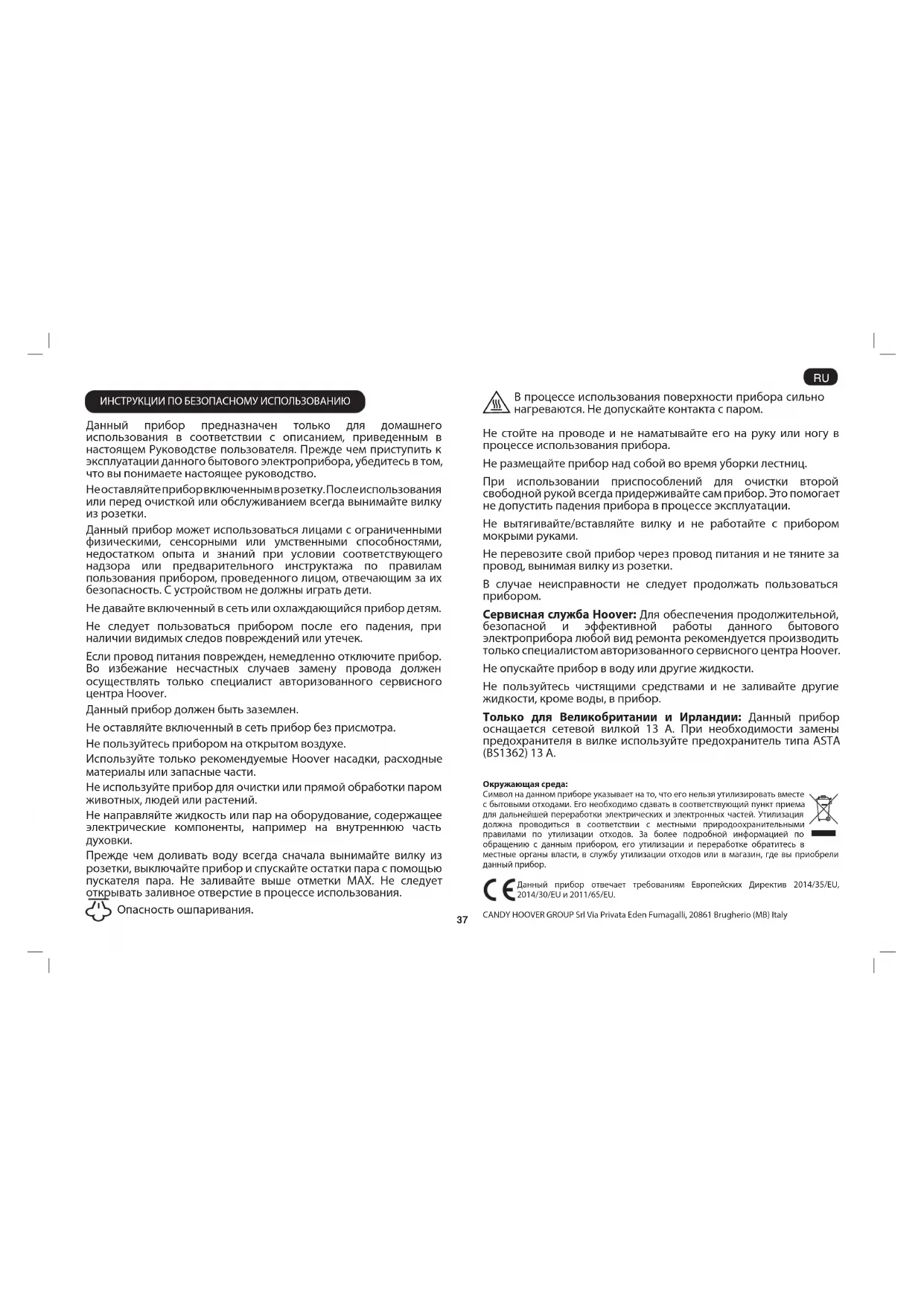 ИНСТРУКЦИИ ПО БЕЗОПАСНОМУ ИСПОЛЬЗОВАНИЮ Данный прибор предназначен только для домашнего использования в соответствии с описанием, приведенным в настоящем Руководстве пользователя. Прежде чем приступить к эксплуатации данного бытового электроприбора, убедитесь в том, что вы понимаете настоящее руководство. Не оставляйте прибор включенным в розетку. После использования или перед очисткой или обслуживанием всегда вынимайте вилку из розетки. Данный прибор может использоваться лицами с ограниченными физическими, сенсорными или умственными способностями, недостатком опыта и знаний при условии соответствующего надзора или предварительного инструктажа по правилам пользования прибором, проведенного лицом, отвечающим за их безопасность. С устройством не должны играть дети. Не давайте включенный в сеть или охлаждающийся прибор детям. Не следует пользоваться прибором после его падения, при наличии видимых следов повреждений или утечек. Если провод питания поврежден, немедленно отключите прибор. Во избежание несчастных случаев замену провода должен осуществлять только специалист авторизованного сервисного центра Hoover. Данный прибор должен быть заземлен. Не оставляйте включенный в сеть прибор без присмотра. Не пользуйтесь прибором на открытом воздухе. Используйте только рекомендуемые Hoover насадки, расходные материалы или запасные части. Не используйте прибор для очистки или прямой обработки паром животных, людей или растений. Не направляйте жидкость или пар на оборудование, содержащее электрические компоненты, например на внутреннюю часть