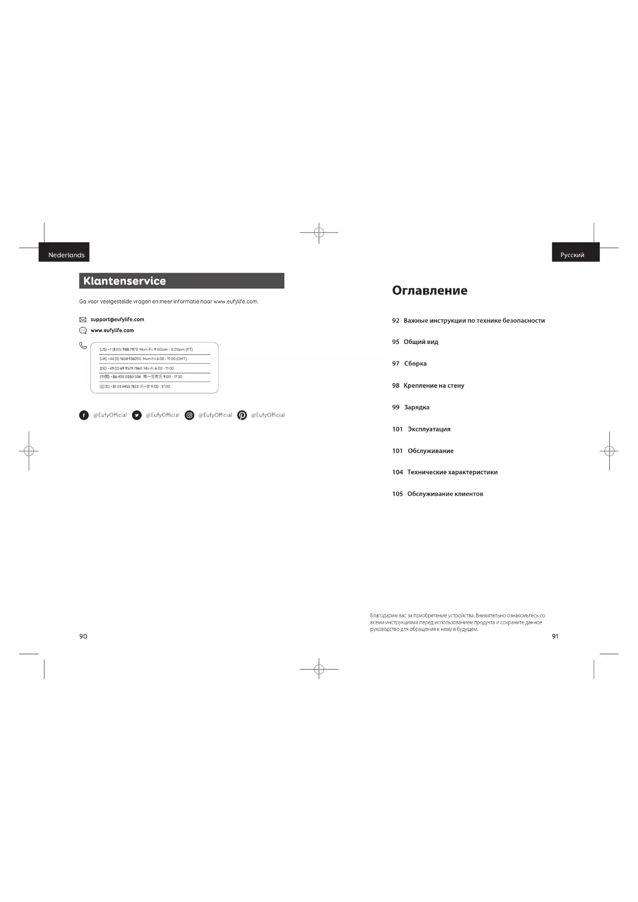 92 Важные инструкции по технике безопасности 95 Общий вид 97 Сборка 98 Крепление на стену 99 Зарядка 101 Эксплуатация 101 Обслуживание 104 Технические характеристики 105 Обслуживание клиентовPусский Pусский
