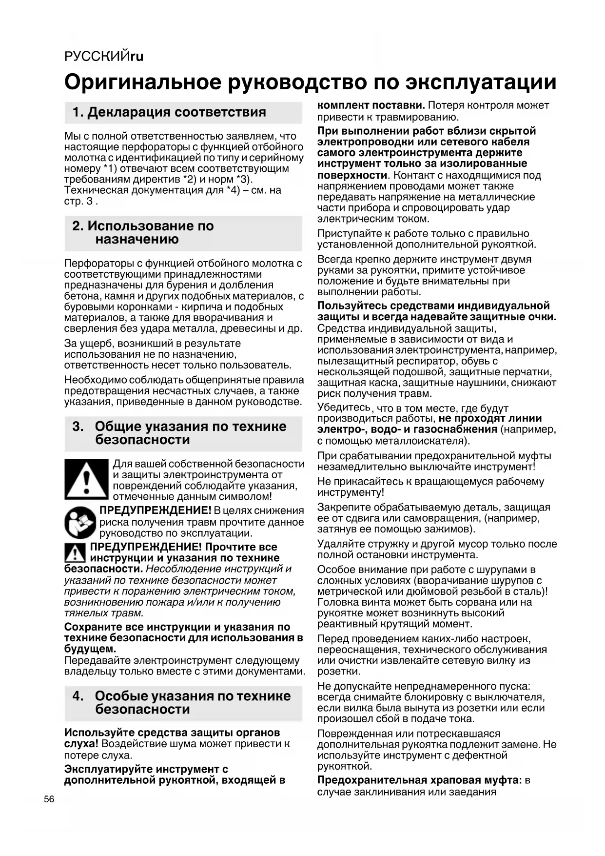 Передавайте электроинструмент следующему владельцу только вместе с этими документами. Используйте средства защиты органов слуха! Воздействие шума может привести к потере слуха. Эксплуатируйте инструмент с дополнительной рукояткой, входящей в комплект поставки. Потеря контроля может