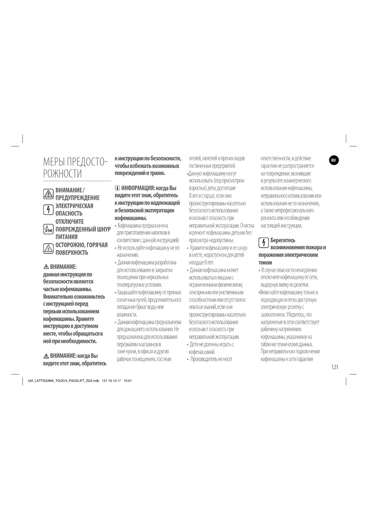 UM_LATTISSIMA_TOUCH_FACELIFT_Z2A.indb 121 19.10.17 10:01аннулируется. Кофемашина должна быть подключена к сети только после ее установки