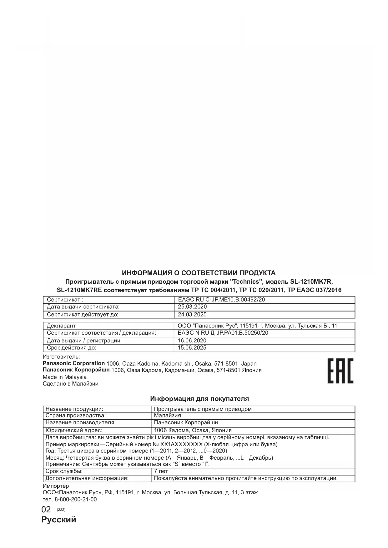 Декларант ООО "Панасоник Рус", 115191, г. Москва, ул. Тульская Б., 11 Сертификат соответствия / декларация: ЕАЭС N RU Д-JP.РА01.В.50250/20 Дата выдачи / регистрации:16.06.2020 Срок действия до:15.06.2025 Сертификат : ЕАЭС RU C-JP.МЕ10.B.00492/20 Дата выдачи сертификата:25.03.2020 Сертификат действует до:24.03.2025 Название продукции: Проигрыватель с прямым приводом Страна производства: Малайзия Название производителя: Панасоник Корпорэйшн Юридический адрес:1006 Кадома, Осака, Япония Дата виробництва: ви можете знайти рік і місяць виробництва у серійному номері, вказаному на табличці. Пример маркировки—Серийный номер № XX1АХХХХХХХ (Х-любая цифра или буква) Го д : Трeтья цифра в серийном номере (1—2011, 2—2012, ...0—2020) Месяц: Четвeртая бyква в серийном номере (А—Январь, В—Февраль, ...L—Декабрь) Примечание: Сентябрь может указываться как “S” вместо “I”. Срок службы:7 лет Дополнительная информация: Пожалуйста внимательно прочитайте инструкцию по эксплуатации. ИНФОРМАЦИЯ О СООТВЕТСТВИИ ПРОДУКТА Информация для покупателя Проигрыватель с прямым приводом торговой марки "Technics", модель SL-1210MK7R, SL-1210MK7RE соответствует требованиям ТР ТС 004/2011, ТР ТС 020/2011, ТР ЕАЭС 037/2016 Изготовитель: Panasonic Corporation 1006, Oaza Kadoma, Kadoma-shi, Osaka, 571-8501 Japan Панасоник Корпорэйшн 1006, Оаза Кадома, Кадома-ши, Осака, 571-8501 Япония Made in Malaysia Сделано в Малайзии