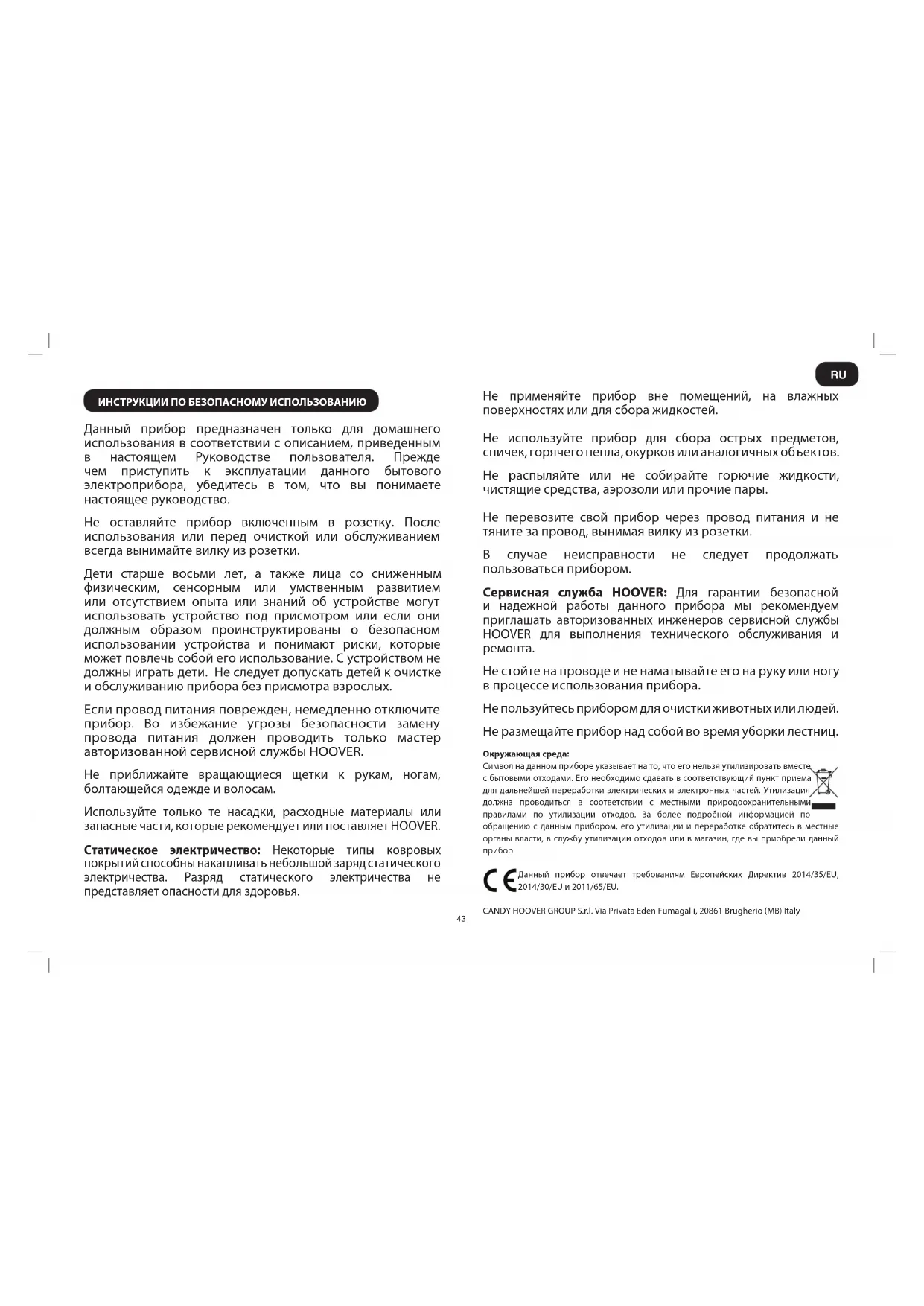 Ο κατασκευαστής διατηρεί το δικαίωμα να επιφέρει αλλαγές χωρίς προγενέστερη ενημέρωση.43 ИНСТРУКЦИИ ПО БЕЗОПАСНОМУ ИСПОЛЬЗОВАНИЮ Данный прибор предназначен только для домашнего использования в соответствии с описанием, приведенным в настоящем Руководстве пользователя. Прежде чем приступить к эксплуатации данного бытового электроприбора, убедитесь в том, что вы понимаете настоящее руководство. Не оставляйте прибор включенным в розетку. После использования или перед очисткой или обслуживанием всегда вынимайте вилку из розетки. Дети старше восьми лет, а также лица со сниженным физическим, сенсорным или умственным развитием или отсутствием опыта или знаний об устройстве могут использовать устройство под присмотром или если они должным образом проинструктированы о безопасном использовании устройства и понимают риски, которые может повлечь собой его использование. С устройством не должны играть дети. Не следует допускать детей к очистке и обслуживанию прибора без присмотра взрослых. Если провод питания поврежден, немедленно отключите прибор. Во избежание угрозы безопасности замену провода питания должен проводить только мастер авторизованной сервисной службы HOOVER. Не приближайте вращающиеся щетки к рукам, ногам, болтающейся одежде и волосам. Используйте только те насадки, расходные материалы или запасные части, которые рекомендует или поставляет HOOVER. Статическое электричество: Некоторые типы ковровых покрытий способны накапливать небольшой заряд статического электричества. Разряд статического электричества не представляет опасности для здоровья. Не применяйте прибор вне помещений, на влажных поверхностях или для сбора жидкостей. Не используйте прибор для сбора острых предметов, спичек, горячего пепла, окурков или аналогичных объектов. Не распыляйте или не собирайте горючие жидкости, чистящие средства, аэрозоли или прочие пары. Не перевозите свой прибор через провод питания и не тяните за провод, вынимая вилку из розетки. В случае неисправности не следует продолжать пользоваться прибором. Сервисная служба HOOVER: Для гарантии безопасной и надежной работы данного прибора мы рекомендуем приглашать авторизованных инженеров сервисной службы HOOVER для выполнения технического обслуживания и