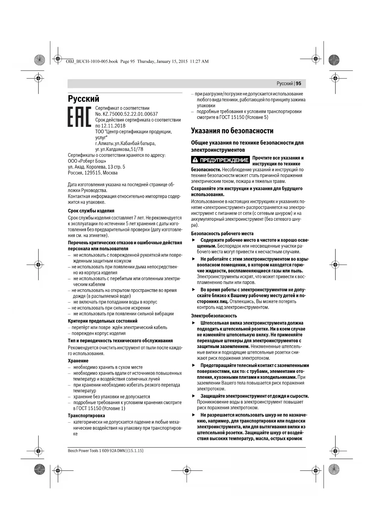 г.Алматы,ул.Кабанбай батыра, уг.ул.Калдаякова,51/78 Сертификаты о соответствии хранятся по адресу: ООО «Роберт Бош» ул. Акад. Королева, 13 стр. 5 Россия, 129515, Москва Дата изготовления указана на последней странице об- ложки Руководства. Контактная информация относительно импортера содер- жится на упаковке. Срок службы изделия Срок службы изделия составляет 7 лет. Не рекомендуется к эксплуатации по истечении 5 лет хранения с даты изго- товления без предварительной проверки (дату изготовле- ния см. на этикетке). Перечень критических отказов и ошибочные действия персонала или пользователя – не использовать с поврежденной рукояткой или повре- жденным защитным кожухом – не использовать при появлении дыма непосредствен- но из корпуса изделия – не использовать с перебитым или оголенным электри- ческим кабелем – не использовать на открытом пространстве во время дождя (в распыляемой воде) – не включать при попадании воды в корпус – не использовать при сильном искрении – не использовать при появлении сильной вибрации Критерии предельных состояний – перетёрт или повре ждён электрический кабель – поврежден корпус изделия Тип и периодичность технического обслуживания Рекомендуется очистить инструмент от пыли после каждо- го использования.