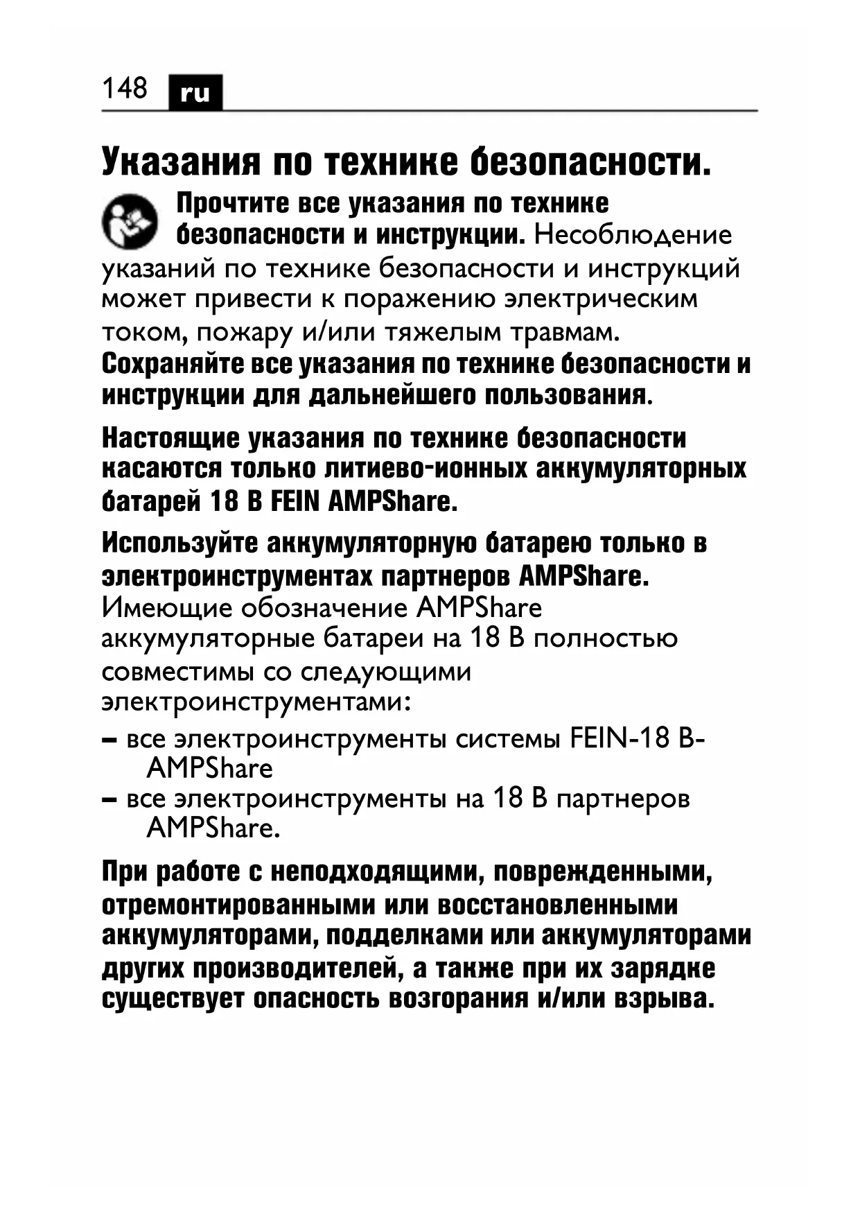 Указания по технике безопасности. Прочтите все указания по технике безопасности и инструкции. Несоблюдение указаний по технике безопасности и инструкций может привести к поражению электрическим током, пожару и/или тяжелым травмам. Сохраняйте все указания по технике безопасности и инструкции для дальнейшего пользования. Настоящие указания по технике безопасности касаются только литиево-ионных аккумуляторных батарей 18 В FEIN AMPShare. Используйте аккумуляторную батарею только в электроинструментах партнеров AMPShare. Имеющие обозначение AMPShare аккумуляторные батареи на 18 В полностью совместимы со следующими электроинструментами: – все электроинструменты системы FEIN-18 В- AMPShare – все электроинструменты на 18 В партнеров AMPShare. При работе с неподходящими, поврежденными, отремонтированными или восстановленными аккумуляторами, подделками или аккумуляторами других производителей, а также при их зарядке существует опасность возгорания и/или взрыва.149