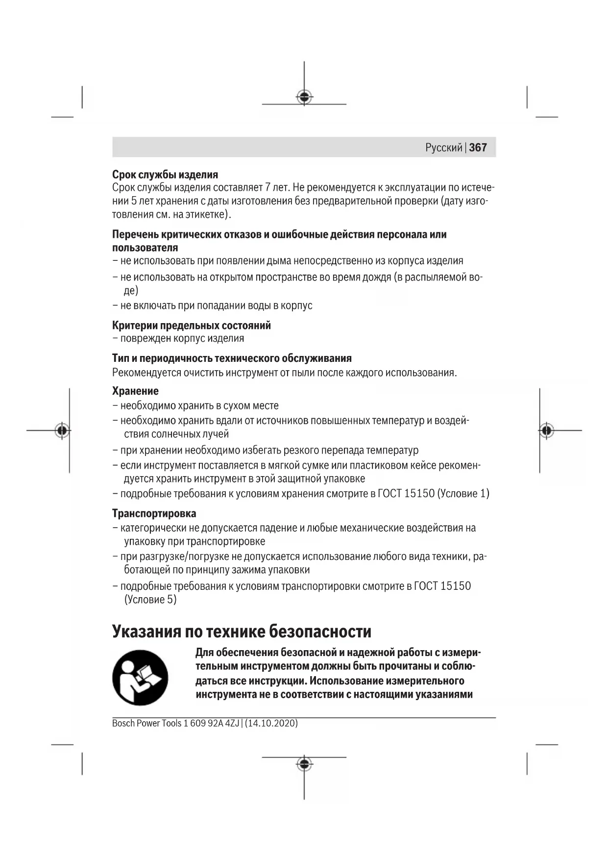 Информация о подтверждении соответствия содержится в приложении. Информация о стране происхождения указана на корпусе изделия и в приложении. Дата изготовления указана на последней странице обложки Руководства или на кор- пусе изделия. Контактная информация относительно импортера содержится на упаковке. 1 609 92A 4ZJ | (14.10.2020) Bosch Power ToolsРусский | 367 Срок службы изделия Срок службы изделия составляет 7 лет. Не рекомендуется к эксплуатации по истече- нии 5 лет хранения с даты изготовления без предварительной проверки (дату изго- товления см. на этикетке). Перечень критических отказов и ошибочные действия персонала или пользователя – не использовать при появлении дыма непосредственно из корпуса изделия – не использовать на открытом пространстве во время дождя (в распыляемой во-