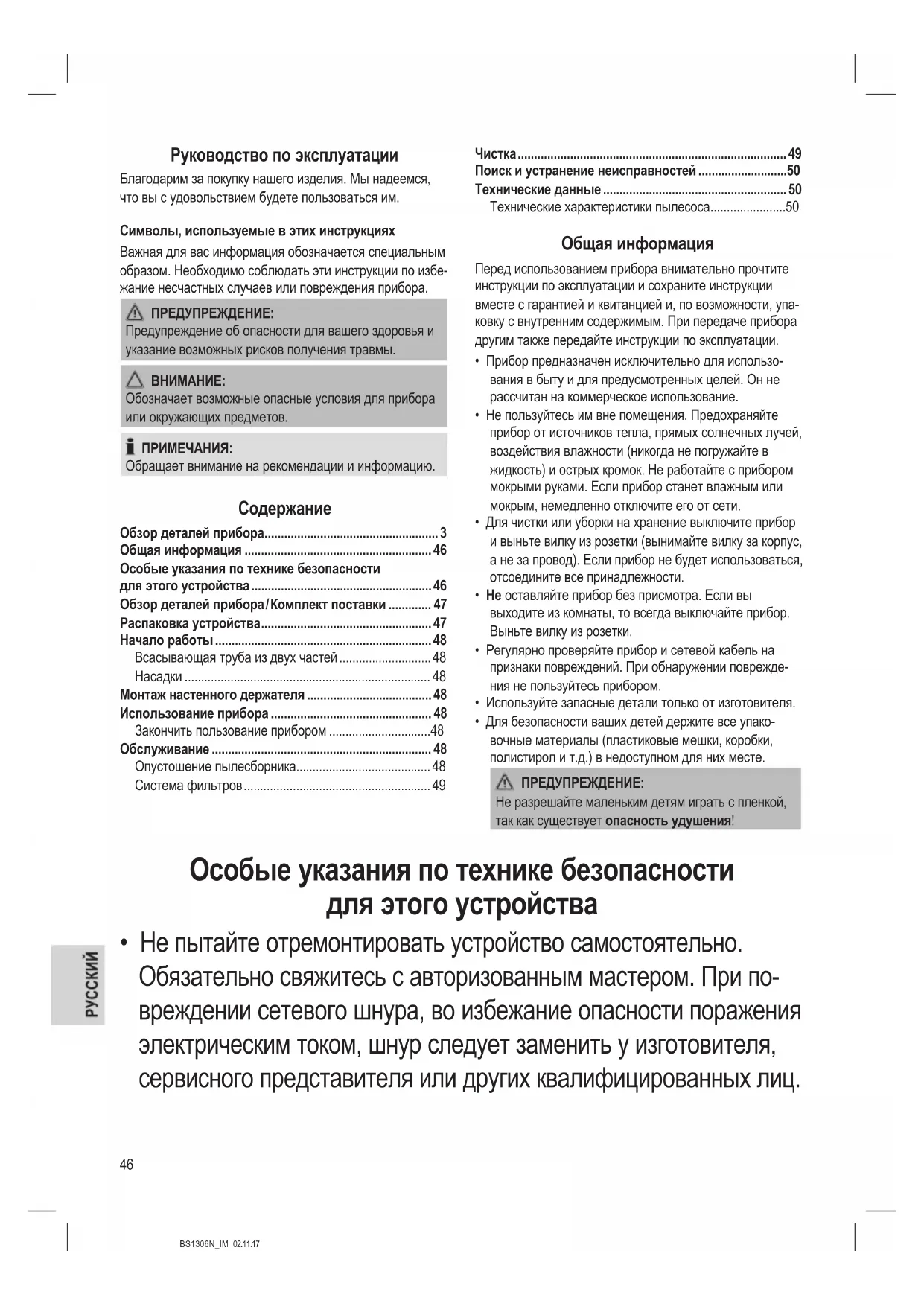 - Не пытайте отремонтировать устройство самостоятельно. Обязательно свяжитесь с авторизованным мастером. При по- вреждении сетевого шнура, во избежание опасности поражения электрическим током, шнур следует заменить у изготовителя, сервисного представителя или других квалифицированных лиц.47 BS1306N_IM 02.11.17