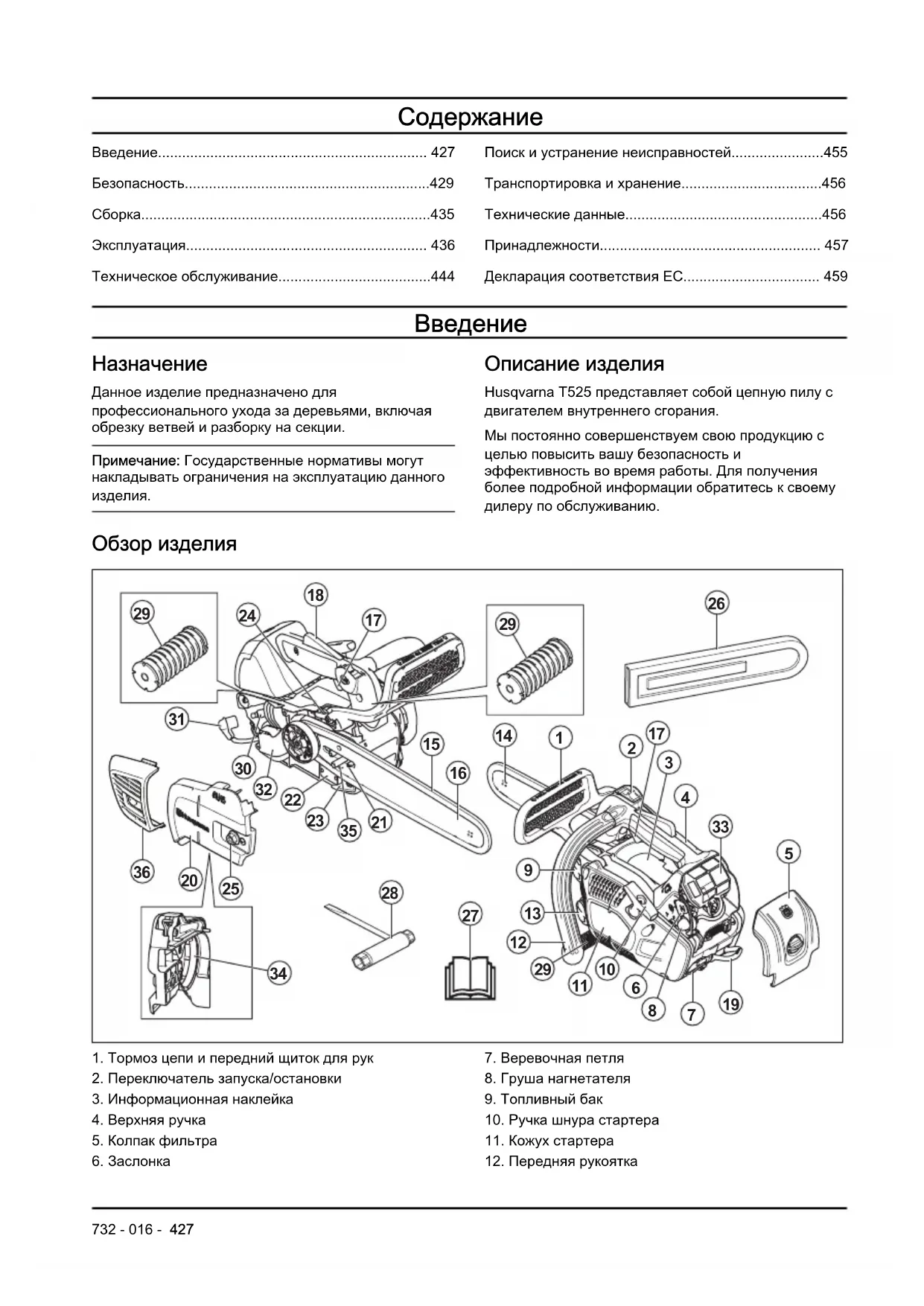 Описание изделия Husqvarna T525 представляет собой цепную пилу с двигателем внутреннего сгорания. Мы постоянно совершенствуем свою продукцию с целью повысить вашу безопасность и эффективность во время работы. Для получения более подробной информации обратитесь к своему дилеру по обслуживанию. Обзор изделия
