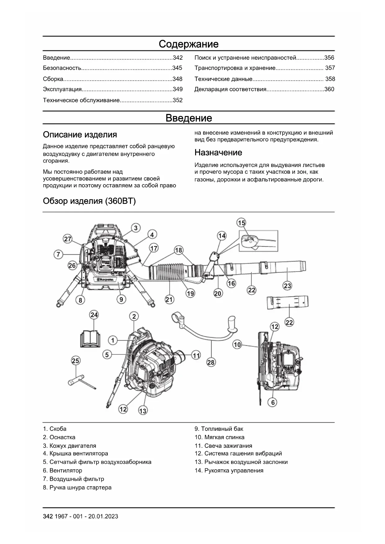 1967 - 001 - 20.01.2023 359Декларация соответствия Декларация соответствия ЕС Мы, Husqvarna AB, SE-561 82 Huskvarna, Швеция, тел.: +46-36-146500, с полной ответственностью заявляем, что изделие: Описание Ранцевый воздуходув Марка Husqvarna Тип / Модель 360BT, 570BTS, 580BTS Идентификация Серийные номера начиная с 2022 (360BT), 2023 (570BTS, 580BTS) года и далее. полностью соответствует следующим директивам и нормативам ЕС: Норматив Описание 2006/42/EC "О механическом оборудовании" 2014/30/EU "Об электромагнитной совместимости" 2000/14/EC "Об излучении шума в окружающую среду" 2011/65/EU "Об ограничении использования определенных опасных веществ в электриче- ском и электронном оборудовании" а также требованиям следующих стандартов и/или технических регламентов: EN