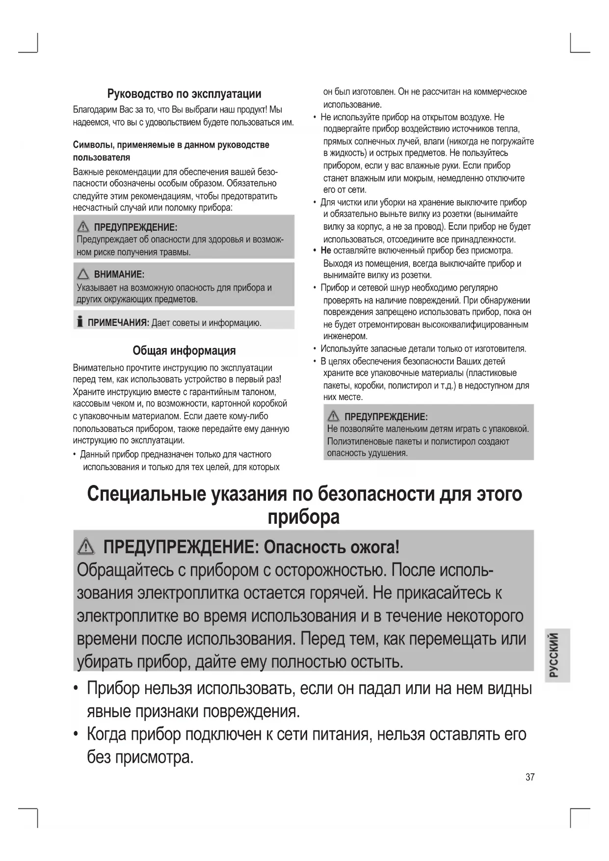 ПРЕДУПРЕЖДЕНИЕ: Опасность ожога! Обращайтесь с прибором с осторожностью. После исполь- зования электроплитка остается горячей. Не прикасайтесь к электроплитке во время использования и в течение некоторого времени после использования. Перед тем, как перемещать или убирать прибор, дайте ему полностью остыть.