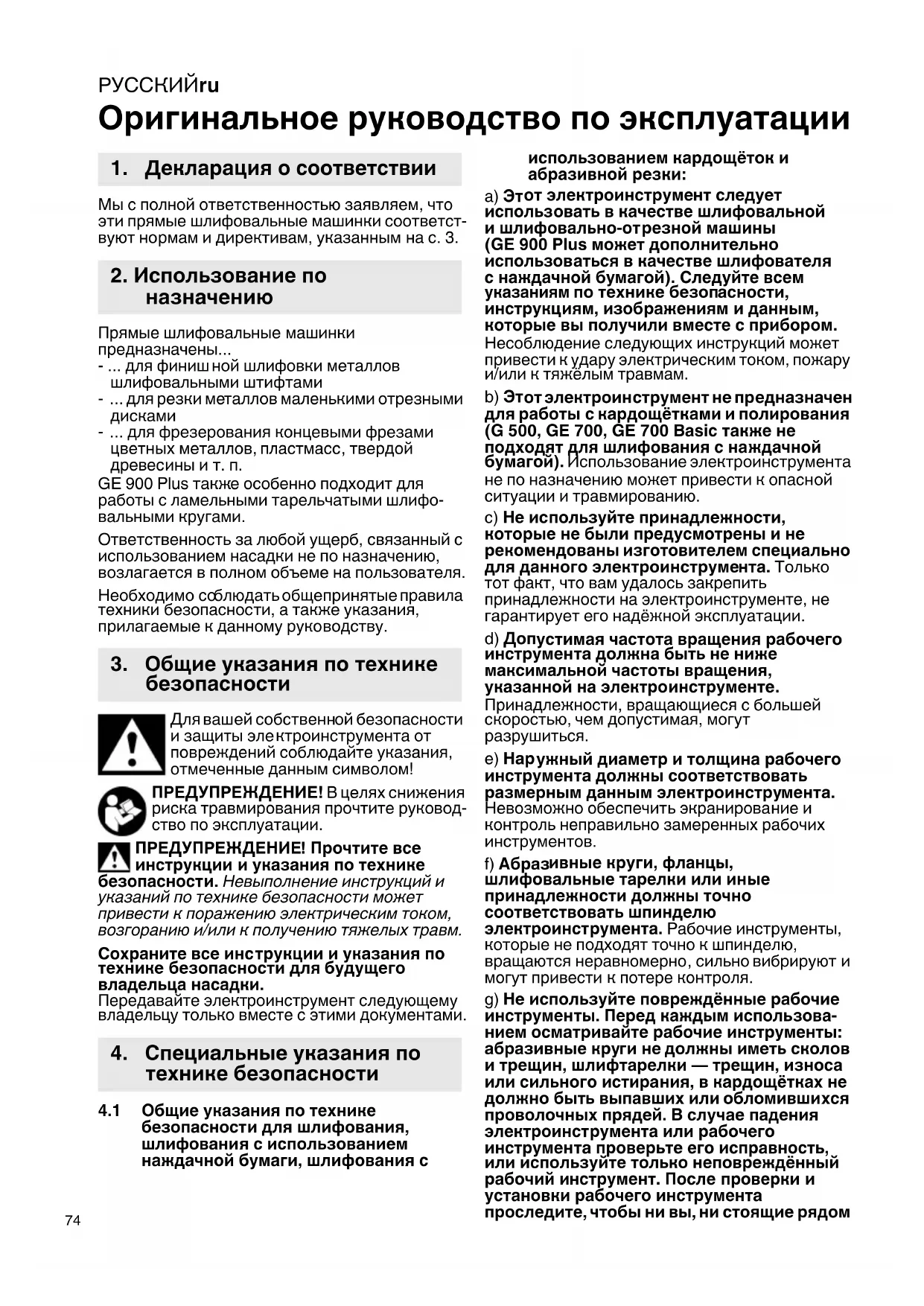 безопасности для шлифования, шлифования с использованием наждачной бумаги, шлифования с использованием кардощёток и абразивной резки: a) Эт от электроинструмент следует использовать в качестве шлифовальной и шлифовально-от резной машины (GE 900 Plus мож ет дополнительно использоваться в качестве шлифователя с наждачной бу магой). Следуйте всем