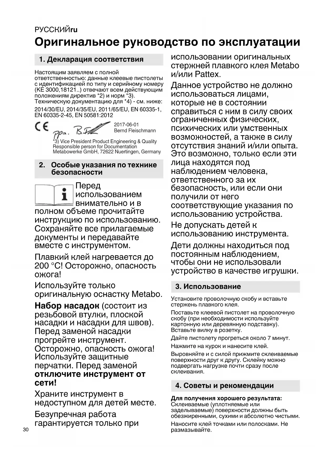 Оригинальное руководство по эксплуатации Настоящим заявляем с полной ответственностью: данные клеевые пистолеты с идентификацией по типу и серийному номеру (KE 3000,18121..) отвечают всем действующим положениям директив *2) и норм *3). Техническую документацию для *4) - см. ниже: 2014/30/EU, 2014/35/EU, 2011/65/EU, EN 60335-1, EN 60335-2-45, EN 50581:2012