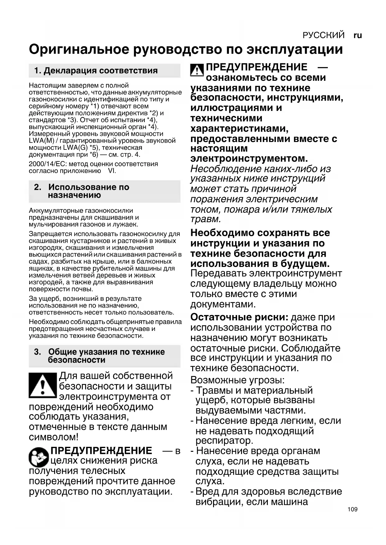 Оригинальное руководство по эксплуатации Настоящим заверяем с полной ответственностью, что данные аккумуляторные газонокосилки с идентификацией по типу и серийному номеру *1) отвечают всем действующим положениям директив *2) и стандартов *3). Отчет об испытании *4), выпускающий инспекционный орган *4). Измеренный уровень звуковой мощности LWA(M) / гарантированный уровень звуковой мощности LWA(G) *5), техническая документация при *6) — см. стр.4. 2000/14/EС: метод оценки соответствия согласно приложению VI. Аккумуляторные газонокосилки предназначены для скашивания и мульчирования газонов и лужаек. Запрещается использовать газонокосилку для скашивания кустарников и растений в живых изгородях, скашивания и измельчения вьющихся растений или скашивания растений в садах, разбитых на крыше, или в балконных ящиках, в качестве рубительной машины для измельчения ветвей деревьев и живых изгородей, а также для выравнивания поверхности почвы. За ущерб, возникший в результате использования не по назначению, ответственность несет только пользователь. Необходимо соблюдать общепринятые правила предотвращения несчастных случаев и указания по технике безопасности. Для вашей собственной безопасности и защиты электроинструмента от повреждений необходимо соблюдать указания, отмеченные в тексте данным
