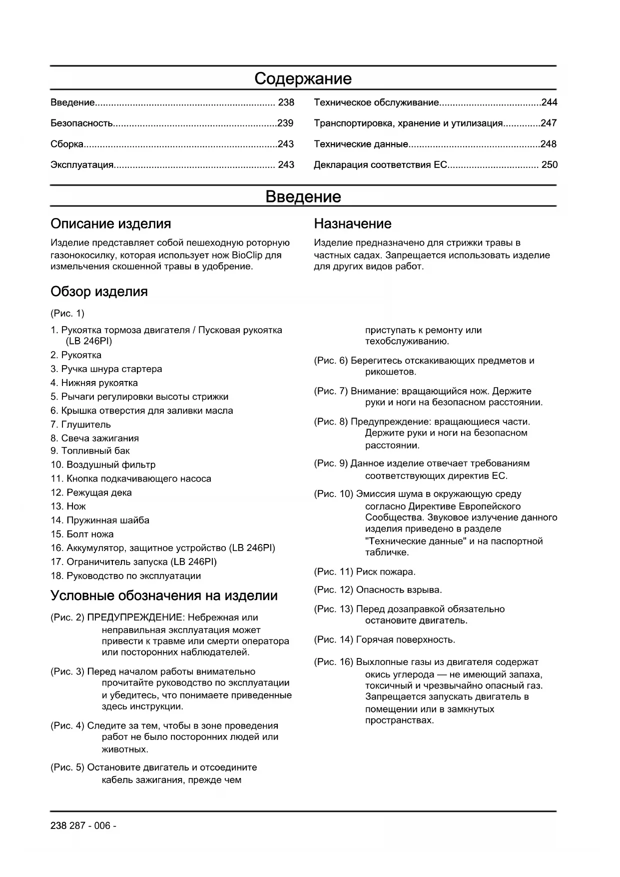(Pис. 11) Риск пожара. (Pис. 12) Опасность взрыва. (Pис. 13) Перед дозаправкой обязательно остановите двигатель. (Pис. 14) Горячая поверхность. (Pис. 16) Выхлопные газы из двигателя содержат окись углерода — не имеющий запаха, токсичный и чрезвычайно опасный газ. Запрещается запускать двигатель в помещении или в замкнутых пространствах. 238 287 - 006 -(Pис. 17) Извлеките защитный выключатель (аккумулятор) перед выполнением работ по техническому обслуживанию или перед тем, как оставить изделие без