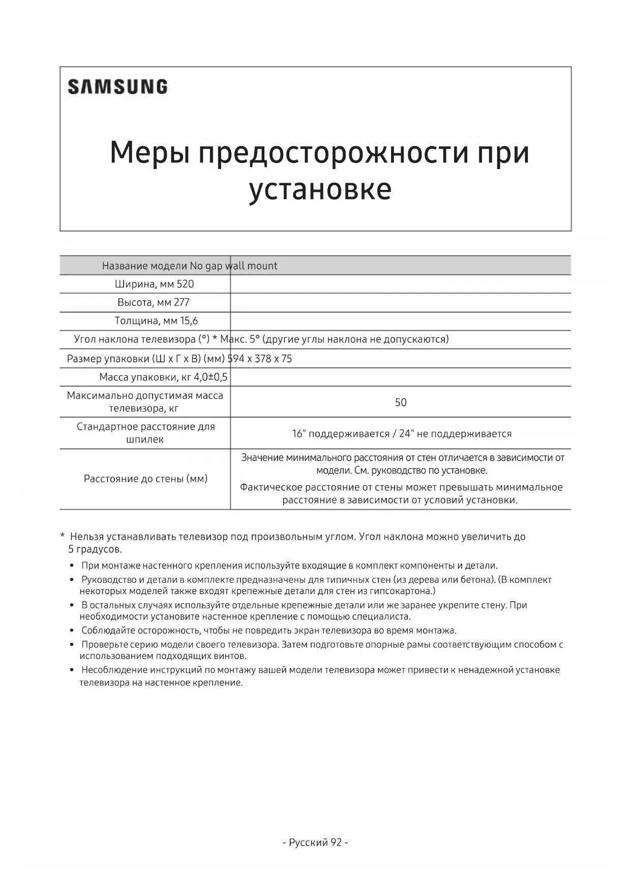 - Чтобы изделие работало оптимальным образом и без неполадок, не выполняйте установку в перечисленных ниже местах. – Места, где могут возникать вибрация и ударные воздействия: изделие может упасть и получить повреждения. – Рядом с противопожарным датчиком: он может среагировать на исходящее от телевизора тепло и запустить оросители. – Рядом с кабелями высокого давления: на работу телевизора и изображение на экране могут влиять помехи от такого кабеля. – Рядом с нагревательными приборами: телевизор может перегреться и выйти из строя. – Выполняйте установку только на вертикальную стену. – Устанавливайте телевизор в недоступных для детей местах. – Не проделывайте выемки и отверстия для установки внутри стены. – Уточните тип и состояние стены, на которую выполняется монтаж. – Выбор используемых материалов зависит от типа стены. При выборе материалов руководствуйтесь приведенными ниже характеристиками. – Использовать все входящие в комплект винты нет необходимости. Минимальное количество используемых винтов– 4шт. – Установка винтов в двух областях, отмеченных на схеме буквой А, является обязательной. – Помимо этого, используйте для крепления не менее двух областей, отмеченных на схеме буквой В, в зависимости от монтажной поверхности. – Для скрытия кабелей внутри стены обратитесь к специалисту-монтажнику.- Українська 98 - - Українська 99 - Застереження щодо встановлення Назва моделі No gap wall mount Ширина (мм) 520 Висота (мм) 277 Товщина (мм) 15,6 Нахил телевізора (°) * Макс. 5° (інші кути нахилу заборонені) Розмір упаковки (Ш x Г x В) (мм) 594 x 378 x 75 Вага пакування (кг) 4,0±0,5 Макс. допустима вага телевізора
