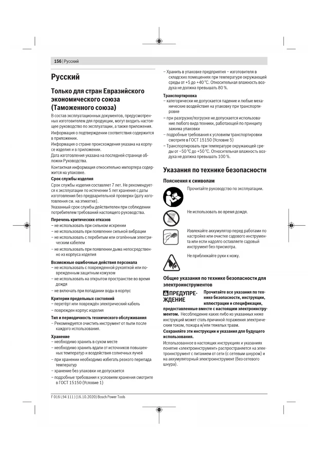 Неисправность штепсельной розетки, кабеля питания или зарядного устройства Проверьте напряжение сети, при надобности сдайте зарядное устройство в авторизованную мастерскую электроинструментов фирмы Bosch Техобслуживание и сервис Техобслуживание, очистка и хранение u Извлекайте аккумулятор перед выполнением лю- бых манипуляций с садовым инструментом (напр., работами по техническому обслуживанию, заме- ной рабочего инструмента и т.п.), а также при транспортировке и хранении садового инструмен- та. При непреднамеренном приведении в действие выключателя возникает опасность травмирования. u Для качественной и надежной работы содержите изделие в чистоте. Не ставьте другие предметы на садовый инструмент. Для качественной и надежной работы поддерживайте из- делие и вентиляционные щели в чистоте. Никогда не обрызгивайте изделие водой. Никогда не окунайте изделие в воду. Кладите изделие на хранение в надежное, сухое и недо- ступное для детей место. Не ставьте другие предметы на изделие. Проверяйте все гайки, болты и винты на предмет проч- ной посадки с целью обеспечения безопасного рабочего состояния изделия. Проверяйте изделие и для надежности заменяйте изно- сившиеся или поврежденные детали. Для замены используйте оригинальные запасные части фирмы Bosch. Реализацию продукции разрешается производить в мага- зинах, отделах (секциях), павильонах и киосках, обеспе- чивающих сохранность продукции, исключающих попа- дание на неё атмосферных осадков и воздействие источ- ников повышенных температур (резкого перепада темпе- ратур), в том числе солнечных лучей. Продавец (изготовитель) обязан предоставить покупате- лю необходимую и достоверную информацию о продук- ции, обеспечивающую возможность её правильного вы- бора. Информация о продукции в обязательном порядке должна содержать сведения, перечень которых установ- лен законодательством Российской Федерации. Bosch Power Tools F 016 L94 111 | (16.10.2020)166 | Русский Если приобретаемая потребителем продукция была в употреблении или в ней устранялся недостаток (недостат- ки), потребителю должна быть предоставлена информа- ция об этом. В процессе реализации продукции должны выполняться следующие требования безопасности: – Продавец обязан довести до сведения покупателя фирменное наименование своей организации, место её нахождения (адрес) и режим её работы; – Образцы продукции в торговых помещениях должны обеспечивать возможность ознакомления покупателя с надписями на изделиях и исключать любые самосто- ятельные действия покупателей с изделиями, приво- дящие к запуску изделий, кроме визуального осмотра; – Продавец обязан довести до сведения покупателя ин- формацию о подтверждении соответствия этих изде- лий установленным требованиям, о наличии сертифи- катов или деклараций о соответствии; – Запрещается реализация продукции при отсутствии (утрате) её идентификационных признаков, с истёк- шим сроком годности, следами порчи и без инструк- ции (руководства) по эксплуатации, обязательного сертификата соответствия либо знака соответствия. Уход за аккумулятором Чтобы гарантировать оптимальную работу аккумулятора, соблюдайте следующие указания и принимайте следую-