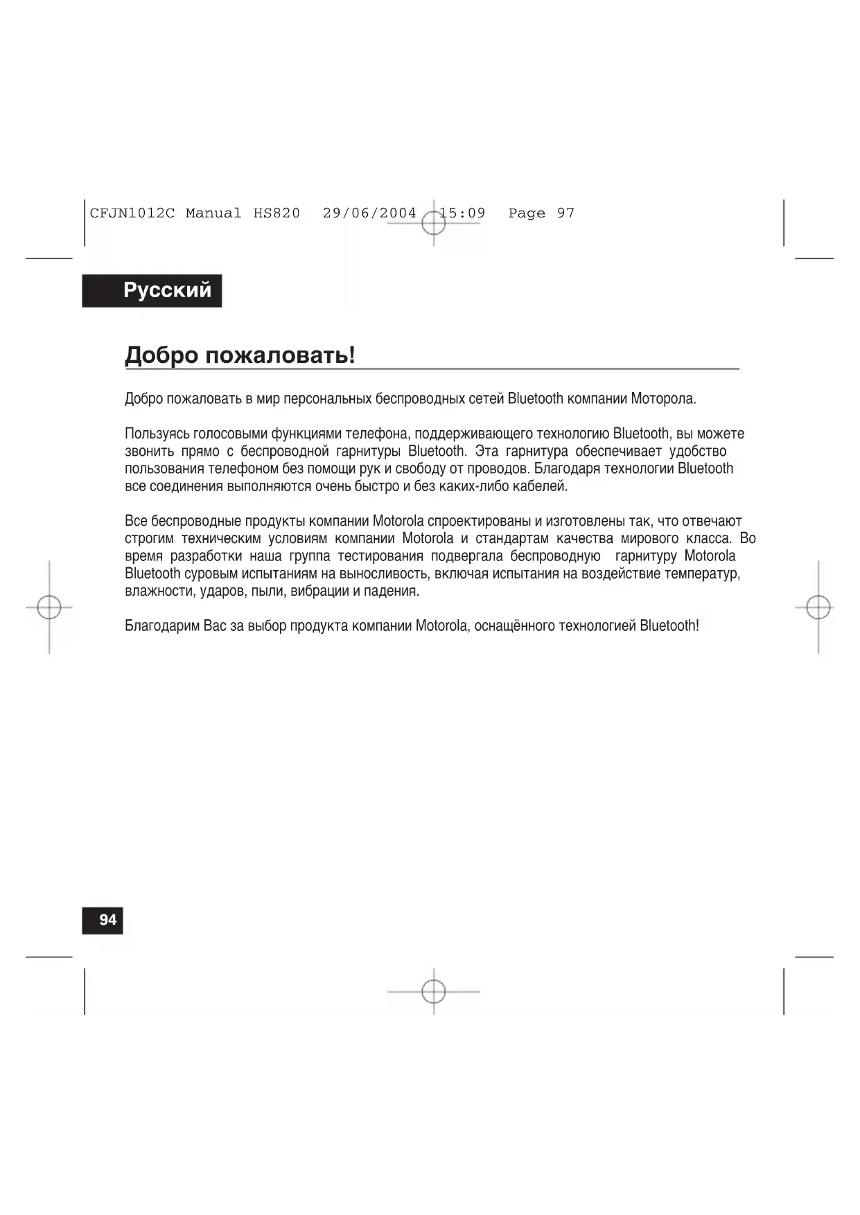 Русcкий CFJN1012C Manual HS820 29/06/2004 15:09 Page 9795 Русcкий Общие сведения и информация о безопасной эксплуатации ВАЖНЫЕ СВЕДЕНИЯ ОБ ЭФФЕКТИВНОМ И БЕЗОПАСНОМ ИСПОЛЬЗОВАНИИ. ПРОЧТИТЕ, ПРЕЖДЕ ЧЕМ ПОЛЬЗОВАТЬСЯ УСТРОЙСТВОМ. Пользователям не разрешается вносить изменения в конструкцию или модифицировать устройство каким-либо образом. Модификация или внесение изменений, не одобренные явно соответствующей инстанцией, могут повлечь за собой лишение пользователя права работать с данным оборудованием. См. 47 CFR, параграф 15.21. Настоящее устройство удовлетворяет требованиям части 15 Правил Федеральной комиссии по связи (FCC) и нормам RSS-210 / RSS-139 Industry Canada. При работе данного устройства должны выполняться следующие требования: 1) устройство не должно создавать опасных помех и 2) устройство должно исправно функционировать несмотря на помехи, включая и такие, которые могут вызывать нежелательные действия. См. 47 CFR, параграф 15.19(3). Декларация о соответствии требованиям Европейского союза Настоящим Motorola удостоверяет, что данное изделие ("HS820") соответствует - Основным требованиям Директивы Европейского союза 1999/5/EC Декларацию о соответствии (DoC) Директиве 1999/5/EC (Директиве R&TTE) можно посмотреть на сайте www.motorola.com/rtte Электромагнитные помехи и вопросы совместимости Почти все электронные устройства могут быть подвержены воздействию электромагнитных помех, если они экранированы, спроектированы или сконструированы ненадлежащим образом в смысле электромагнитной совместимости. CFJN1012C Manual HS820 29/06/2004 15:09 Page 98Введение Что такое "беспроводная технология Bluet ooth"? Беспроводная технология Bluetooth вводит вас в новое измерение в связи. Устройства Bluetooth общаются без проводов, с использованием встроенных радиопередатчиков, работающих на глобально доступной частоте для обеспечения совместимости по всему миру. Ваша беспроводная гарнитура Bluetooth может общаться с другими устройствами Bluetooth на расстоянии приблизительно 10 метров. Как я могу пользоваться своим беспроводной гарнитурой? Беспроводная гарнитура, оснащенная технологией Bluetooth, позволяет вам устанавливать связь с другими аналогично оснащёнными устройствами: