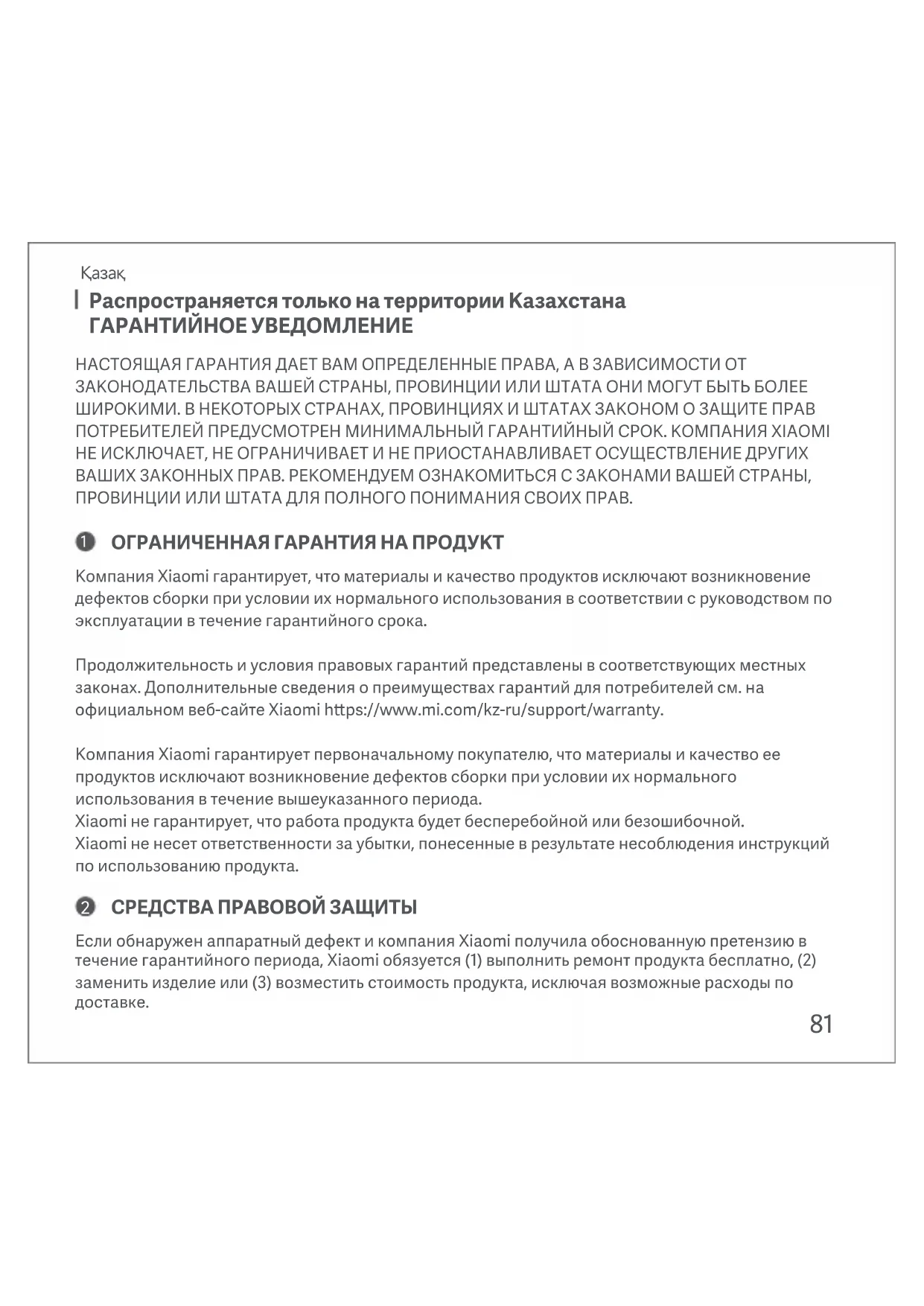Распространяется только на территории Казахстана ГАРАНТИЙНОЕ УВЕДОМЛЕНИЕ НАСТОЯЩАЯ ГАРАНТИЯ ДАЕТ ВАМ ОПРЕДЕЛЕННЫЕ ПРАВА, А В ЗАВИСИМОСТИ ОТ ЗАКОНОДАТЕЛЬСТВА ВАШЕЙ СТРАНЫ, ПРОВИНЦИИ ИЛИ ШТАТА ОНИ МОГУТ БЫТЬ БОЛЕЕ ШИРОКИМИ. В НЕКОТОРЫХ СТРАНАХ, ПРОВИНЦИЯХ И ШТАТАХ ЗАКОНОМ О ЗАЩИТЕ ПРАВ ПОТРЕБИТЕЛЕЙ ПРЕДУСМОТРЕН МИНИМАЛЬНЫЙ ГАРАНТИЙНЫЙ СРОК. КОМПАНИЯ XIAOMI НЕ ИСКЛЮЧАЕТ, НЕ ОГРАНИЧИВАЕТ И НЕ ПРИОСТАНАВЛИВАЕТ ОСУЩЕСТВЛЕНИЕ ДРУГИХ ВАШИХ ЗАКОННЫХ ПРАВ. РЕКОМЕНДУЕМ ОЗНАКОМИТЬСЯ С ЗАКОНАМИ ВАШЕЙ СТРАНЫ, ПРОВИНЦИИ ИЛИ ШТАТА ДЛЯ ПОЛНОГО ПОНИМАНИЯ СВОИХ ПРАВ.