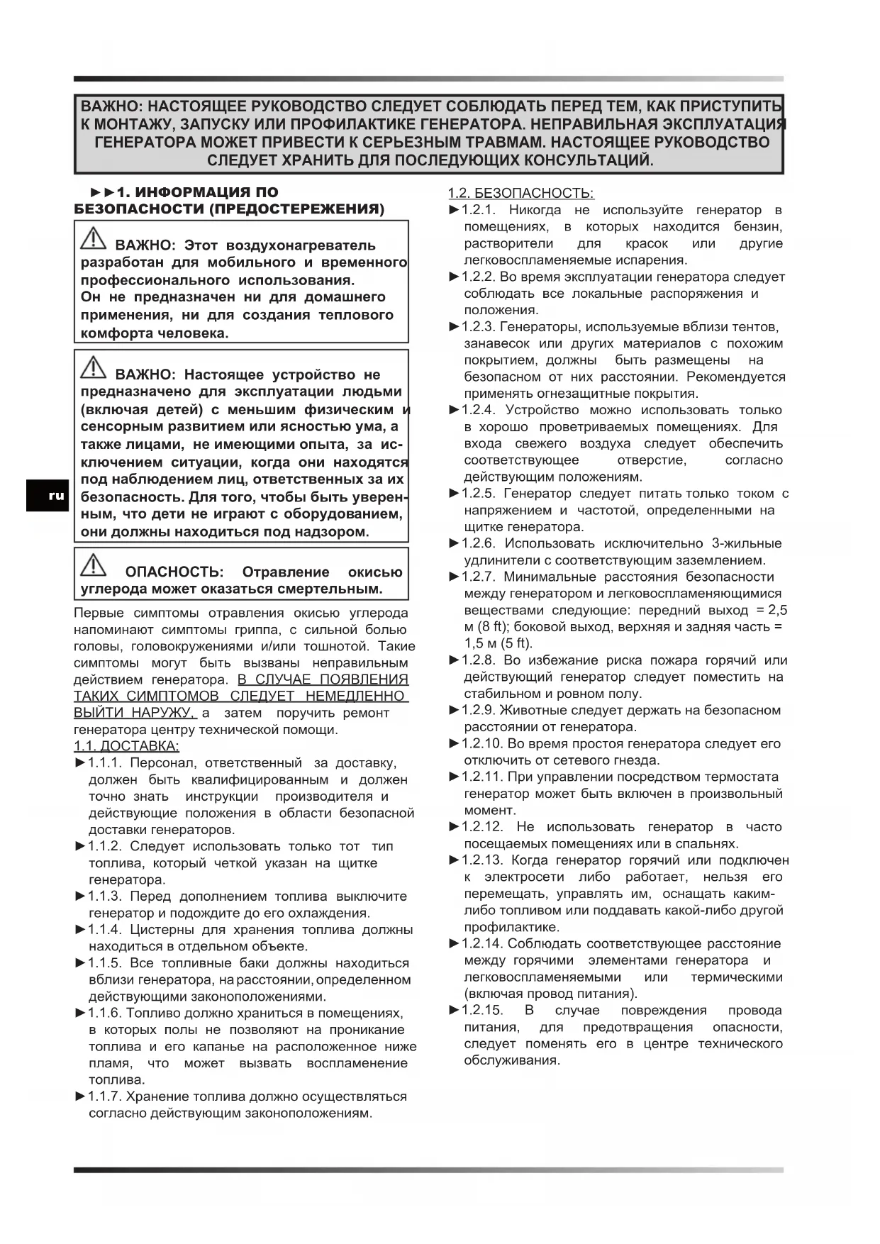 zhВАЖНО: НАСТОЯЩЕЕ РУКОВОДСТВО СЛЕДУЕТ СОБЛЮДАТЬ ПЕРЕД ТЕМ, КАК ПРИСТУПИТЬ К МОНТАЖУ, ЗАПУСКУ ИЛИ ПРОФИЛАКТИКЕ ГЕНЕРАТОРА. НЕПРАВИЛЬНАЯ ЭКСПЛУАТАЦИЯ ГЕНЕРАТОРА МОЖЕТ ПРИВЕСТИ К СЕРЬЕЗНЫМ ТРАВМАМ. НАСТОЯЩЕЕ РУКОВОДСТВО СЛЕДУЕТ ХРАНИТЬ ДЛЯ ПОСЛЕДУЮЩИХ КОНСУЛЬТАЦИЙ. ►►1. ИНФОРМАЦИЯ ПО БЕЗОПАСНОСТИ (ПРЕДОСТЕРЕЖЕНИЯ) ВАЖНО: Этот воздухонагреватель разработан для мобильного и временного профессионального использования. Он не предназначен ни для домашнего применения, ни для создания теплового комфорта человека. ВАЖНО: Настоящее устройство не предназначено для эксплуатации людьми (включая детей) с меньшим физическим и сенсорным развитием или ясностью ума, а также лицами, не имеющими опыта, за ис- ключением ситуации, когда они находятся под наблюдением лиц, ответственных за их безопасность. Для того, чтобы быть уверен- ным, что дети не играют с оборудованием, они должны находиться под надзором. ОПАСНОСТЬ: Отравление окисью углерода может оказаться смертельным. Первые симптомы отравления окисью углерода напоминают симптомы гриппа, с сильной болью головы, головокружениями и/или тошнотой. Такие симптомы могут быть вызваны неправильным действием генератора. В СЛУЧАЕ ПОЯВЛЕНИЯ ТАКИХ СИМПТОМОВ СЛЕДУЕТ НЕМЕДЛЕННО ВЫЙТИ НАРУЖУ, а затем поручить ремонт генератора центру технической помощи. 1.1. ДОСТАВКА: ►1.1.1. Персонал, ответственный за доставку, должен быть квалифицированным и должен точно знать инструкции производителя и действующие положения в области безопасной доставки генераторов. ►1.1.2. Следует использовать только тот тип топлива, который четкой указан на щитке генератора. ►1.1.3. Перед дополнением топлива выключите генератор и подождите до его охлаждения. ►1.1.4. Цистерны для хранения топлива должны находиться в отдельном объекте. ►1.1.5. Все топливные баки должны находиться вблизи генератора, на расстоянии, определенном действующими законоположениями. ►1.1.6. Топливо должно храниться в помещениях, в которых полы не позволяют на проникание топлива и его капанье на расположенное ниже пламя, что может вызвать воспламенение