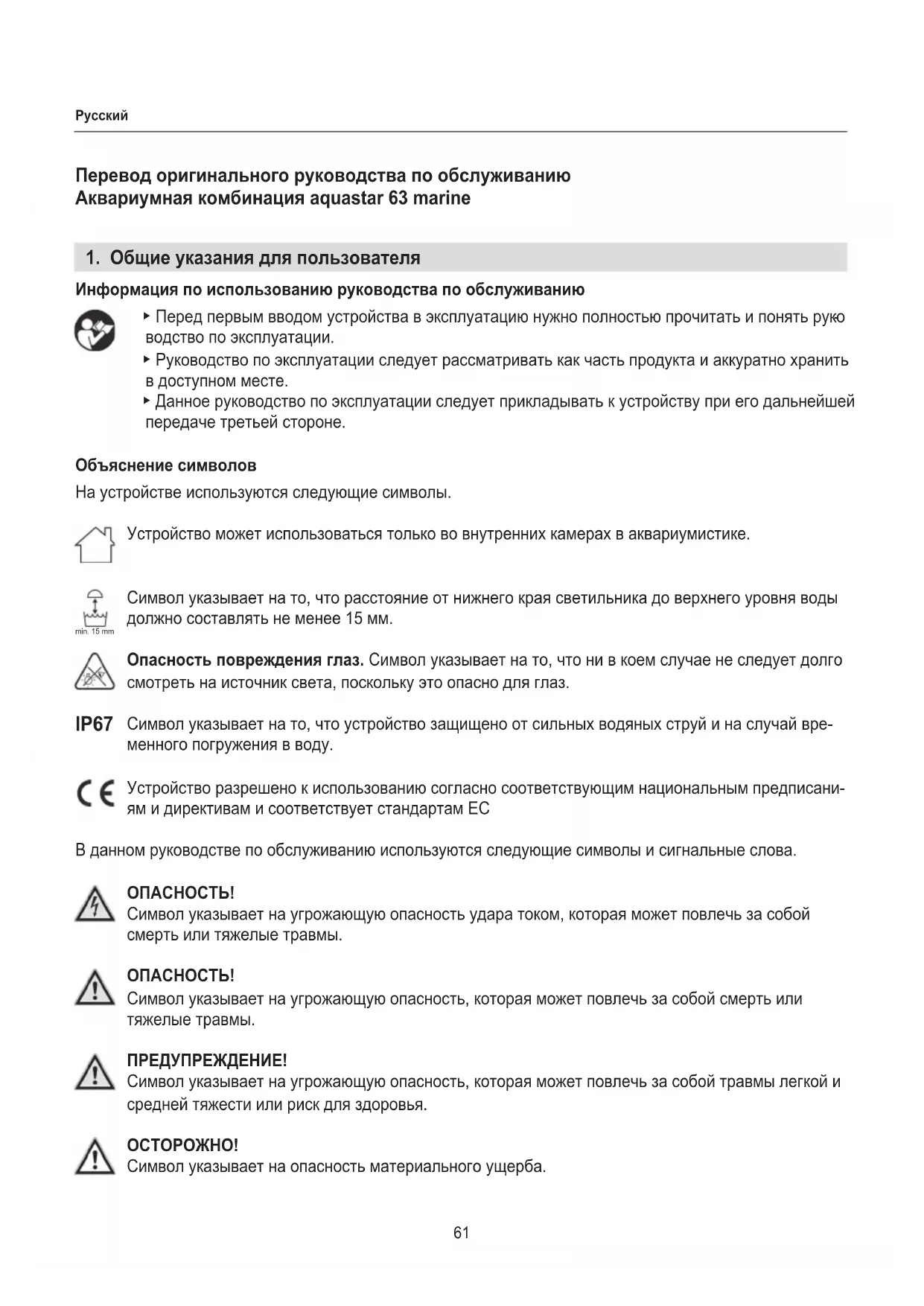 менного погружения в воду. Устройство разрешено к использованию согласно соответствующим национальным предписани- ям и директивам и соответствует стандартам ЕС В данном руководстве по обслуживанию используются следующие символы и сигнальные слова. ОПAСНОСТЬ! Символ указывает на угрожающую опасность удара током, которая может повлечь за собой смерть или тяжелые травмы. ОПAСНОСТЬ! Символ указывает на угрожающую опасность, которая может повлечь за собой смерть или тяжелые травмы. ПРЕДУПРЕЖДЕНИЕ! Символ указывает на угрожающую опасность, которая может повлечь за собой травмы легкой и средней тяжести или риск для здоровья.