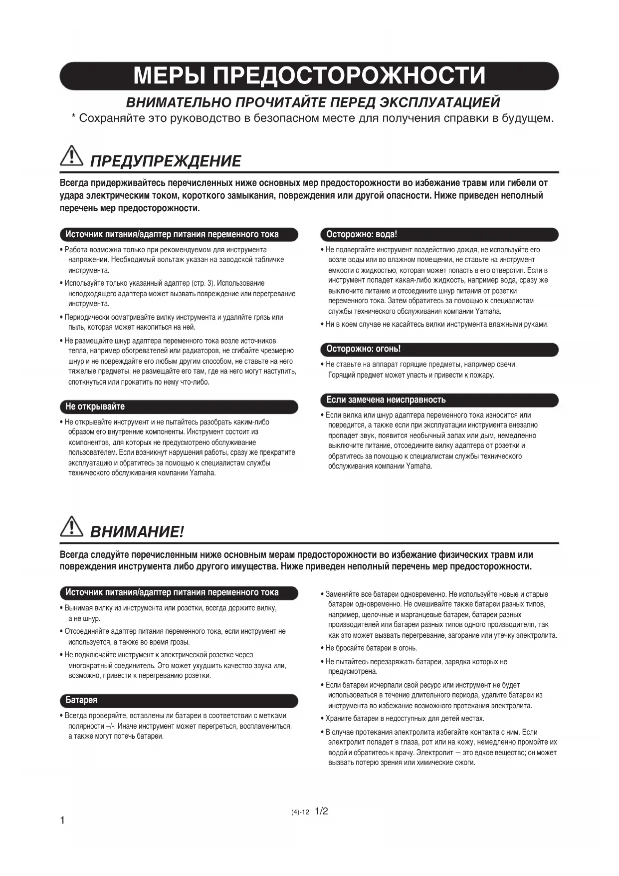 - Сохраняйте это руководство в безопасном месте для получения справки в будущем. ПРЕДУПРЕЖДЕНИЕ Всегда придерживайтесь перечисленных ниже основных мер предосторожности во избежание травм или гибели от удара электрическим током, короткого замыкания, повреждения или другой опасности. Ниже приведен неполный перечень мер предосторожности.• Работа возможна только при рекомендуемом для инструмента напряжении. Необходимый вольтаж указан на заводской табличке инструмента.• Используйте только указанный адаптер (стр. 3). Использование неподходящего адаптера может вызвать повреждение или перегревание инструмента.• Периодически осматривайте вилку инструмента и удаляйте грязь или пыль, которая может накопиться на ней.• Не размещайте шнур адаптера переменного тока возле источников тепла, например обогревателей или радиаторов, не сгибайте чрезмерно шнур и не повреждайте его любым другим способом, не ставьте на него тяжелые предметы, не размещайте его там, где на него могут наступить, споткнуться или прокатить по нему что-либо.• Не открывайте инструмент и не пытайтесь разобрать каким-либо образом его внутренние компоненты. Инструмент состоит из компонентов, для которых не предусмотрено обслуживание пользователем. Если возникнут нарушения работы, сразу же прекратите эксплуатацию и обратитесь за помощью к специалистам службы технического обслуживания компании Yamaha.• Не подвергайте инструмент воздействию дождя, не используйте его возле воды или во влажном помещении, не ставьте на инструмент емкости с жидкостью, которая может попасть в его отверстия. Если в инструмент попадет какая-либо жидкость, например вода, сразу же выключите питание и отсоедините шнур питания от розетки переменного тока. Затем обратитесь за помощью к специалистам службы технического обслуживания компании Yamaha.• Ни в коем случае не касайтесь вилки инструмента влажными руками.• Не ставьте на аппарат горящие предметы, например свечи. Горящий предмет может упасть и привести к пожару.• Если вилка или шнур адаптера переменного тока износится или повредится, а также если при эксплуатации инструмента внезапно пропадет звук, появится необычный запах или дым, немедленно выключите питание, отсоедините вилку адаптера от розетки и обратитесь за помощью к специалистам службы технического обслуживания компании Yamaha. Всегда следуйте перечисленным ниже основным мерам предосторожности во избежание физических травм или повреждения инструмента либо другого имущества. Ниже приведен неполный перечень мер предосторожности.• Вынимая вилку из инструмента или розетки, всегда держите вилку, а не шнур.• Отсоединяйте адаптер питания переменного тока, если инструмент не используется, а также во время грозы.• Не подключайте инструмент к электрической розетке через многократный соединитель. Это может ухудшить качество звука или, возможно, привести к перегреванию розетки.• Всегда проверяйте, вставлены ли батареи в соответствии с метками полярности +/-. Иначе инструмент может перегреться, воспламениться, а также могут потечь батареи.• Заменяйте все батареи одновременно. Не используйте новые и старые батареи одновременно. Не смешивайте также батареи разных типов, например, щелочные и марганцевые батареи, батареи разных производителей или батареи разных типов одного